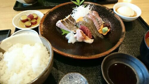 食堂松月の日替わりランチ 夏野菜の黒酢あんかけの野菜と魚がうまうま 刺身もうまうま