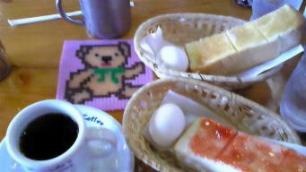クマのコースターがかわいい  卵 トースト が、コーヒーにつきます。
