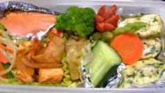 鮭 チキンカチャトーラ ねぎだしまき モヤシと人参 小松菜のナムル風おひたし 焼き茄子のだし浸し ブロッコリー人参 アスパラ茹で野菜 キュウリの浅漬けブロック