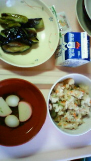 五目ご飯と茄子、冷やし汁。うまいです。