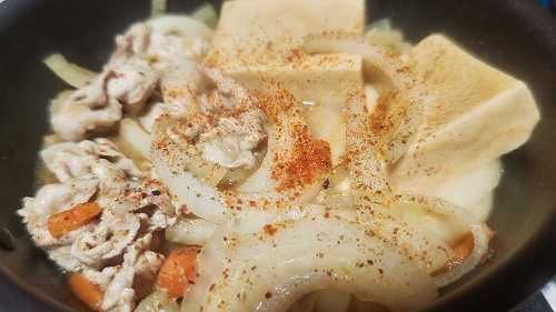 11/23 21:22晩飯に、玉ねぎ一個に豚肉、高野豆腐を、レトルト豚汁二杯分に入れていただきました。