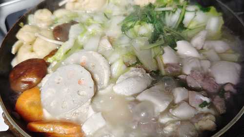 11/26 20:27鍋野菜セットに、レンコンハサミつみれに、もちきんちゃくやら、色々入れていただきました