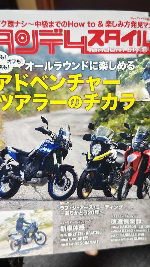 12/03タンデムスタイルいそちゃんさんの80's Meeting 2022の時の記事ですねタンデムスタイル(Tandem Style) 2023年1月号 [雑誌]タンデムスタイル(Tandem Style) 2023年1月号 [雑誌] 雑誌 – 2022/11/24タンデムスタイル編集部 (編集)すべての形式と版を表示Kindle版 (電子書籍)¥611 雑誌¥710 ■特集アドベンチャーツアラーのチカラ・アドベンチャーツアラーとは?・F21インチ・R18インチモデル インプレッション・F19インチ・R17インチモデル インプレッション・F17インチ・R17インチモデル インプレッション・乗降車時の注意点・アドベンチャーツアラーカタログ・ライディングギアカタログ■特別リポート・ラブ・ジ・アース・ミーティング〜ありがとう20年〜■インプレ・新車体感BETA RR2T 125/RR4T 390ROYAL ALLOY GP125ROYAL ENFIELD SCRAM411■好評連載・カスタムという楽しみ方改造倶楽部HONDA NSR250R/CB1300SFYAMAHA RZ250KAWASAKI Z1DUCATI PANIGALE V4RHARLEY-DAVIDSON XLH883■連載・Tokky Garage・日本人初MotoEライダーの世界見聞録・15分ワンバーナークッキング・ぶらり軽井沢・ツーリングフォトGP・みんなで作るお便りコーナー「タンスタ掲示板」・タンスタニュースファイル「ニューモデル紹介」・徳井義実のキャンプライダーへの道・僕らはバイクで旅に出る。・ハシルクエスト・つぐみライダーのオフロー道・タンスタニュースファイル「イベントレポートなど」ほか