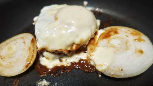 4/24 朝飯大豆ハンバーグに、玉ねぎと、目玉焼きとチーズを重ねて。。。なかなかおいしいです。