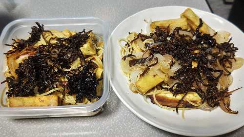 朝飯と昼飯高野豆腐3個と、新玉ねぎ1個をオリーブオイルで炒めてパスタ一束ちりめん山椒と、山椒、きゃぶらぎ入れて炒めて最後に、ししゃもきくらげをかけて。。。ちょこっとだけラー油きくらげもこれで、弘法市で買ったのはなくなった。一か月以上もったなあほんと、ヘルシーでおいしいです