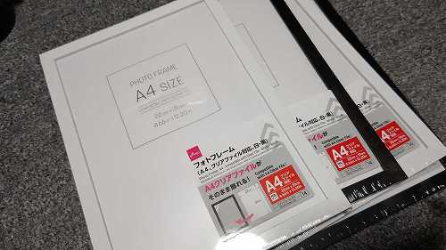 10/31 12:00ダイソーのA4と、クリアファイル対応の額を買ってきた。A4は、ちょっとずれるかもなあ。。。止めるとこ無いんで前は、切って使ってたから、そのままクリアファイル入れれるのは良い。でも、ちょっとスモークかかってるんじゃないかこれ、剥げないのかな