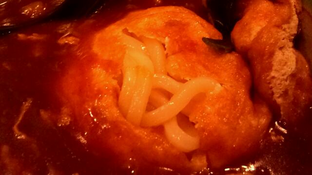 濃いめの味に、巾着でわかれた麺が、よくあいます
