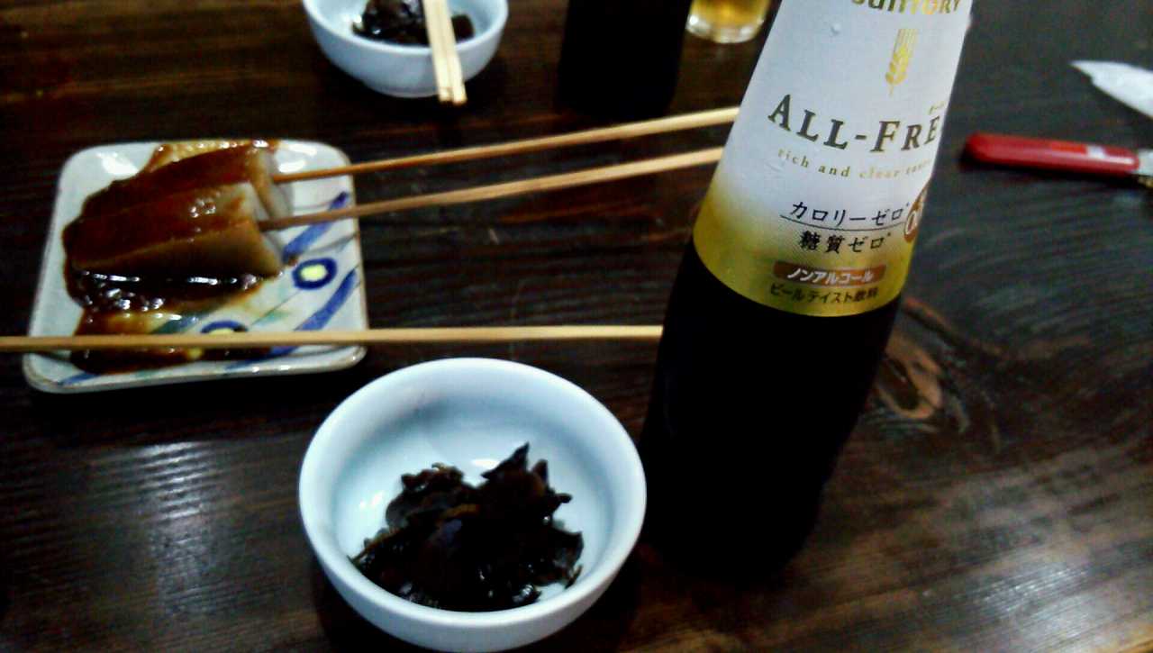 ノンアルコールビールに、味噌こんにゃくおでん、そばです。