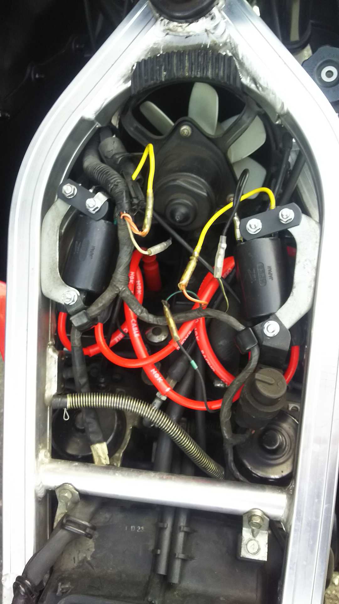 う~む、どうつけるか?ステーを後ろ側につけると、どうやら、ステーを止めるボルトがコイルのコード抜け防止の蓋部分に当たるよう。。。