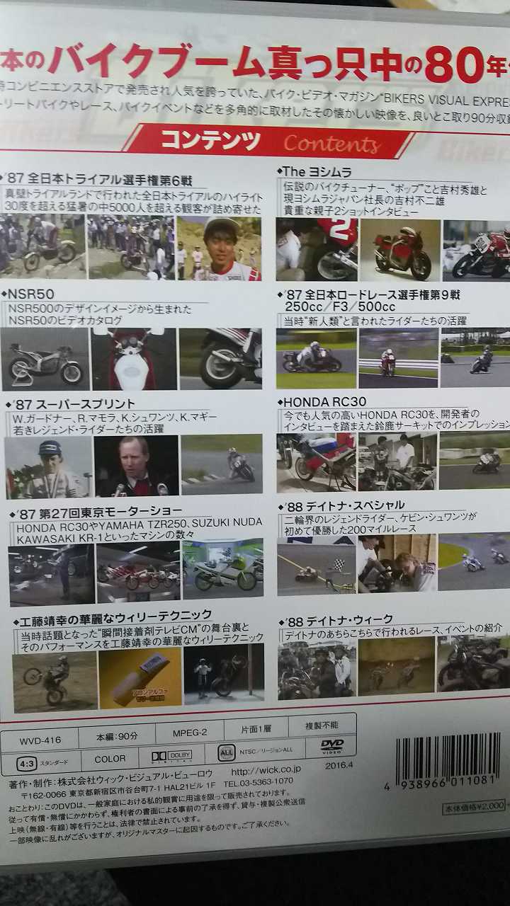 日本のバイクブーム真っ只中の80年代! 当時コンビニエンスストアで発売され人気を誇っていた、バイク・ビデオ・マガジン《BIKERS VISUAL EXPRESS》。ストリートバイクやレース、バイクイベントなどを多角的に取材したその懐かしい映像を、良いとこ取り90分でお届け! コンテンツ ・伝説のバイクチューナー、“ポップ"こと吉村秀雄と、現ヨシムラジャパンの吉村不二雄社長の貴重な親子2ショットインタビュー。 ・今でも人気の高いHONDA RC30を開発者のインタビューを踏まえ鈴鹿サーキットでインプレッション。 ・1987年 第27回東京モーターショーの懐かしの模様! ・当時話題となったあの"瞬間接着剤テレビCM"の舞台裏と、そのパフォーマンスをした工藤靖幸の華麗なウイリーテクニック。(その後、工藤選手はウイリーのギネス記録を樹立) ・全日本選手権ロードレースとトライアルのレースハイライト。まさに雑誌RACERSに登場するライダーやマシンのオンパレードと言える。 ・アメリカ デイトナ特集では、数多くのイベントを紹介すると共に、二輪界のレジェンドライダー、ケビン・シュワンツが初めてデイトナ200マイルで優勝した貴重な映像を収録!