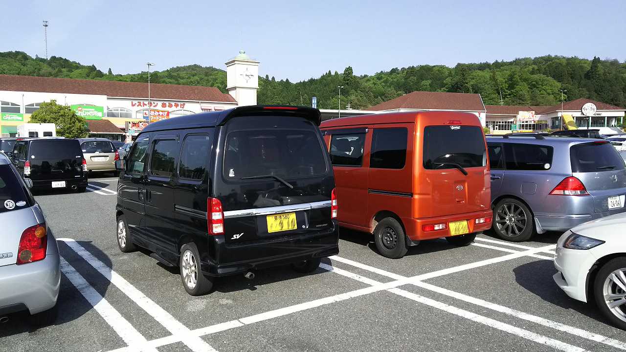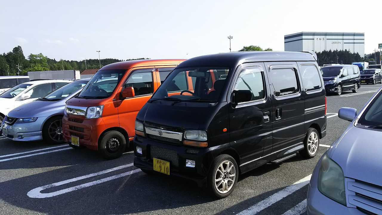 すぐに、この軽バンだってわかりますね。じゃじゃ馬のステッカー貼ってらるし。。。