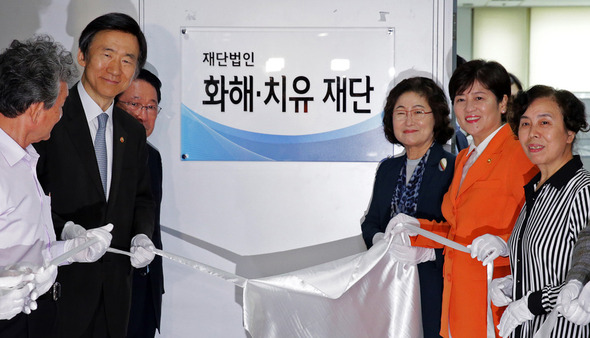 「和解・癒やし財団」が公式に発足する28日、ソウル西大門区のバビエンスイートでキム・テヒョン理事長(右から3人目)、ユン・ビョンセ外交部長官(左から2人目)、カン・ウンヒ女性家族部長官(右から二人目)をはじめ委員らが看板の除幕式を行っている=共同取材写真//ハンギョレ新聞社