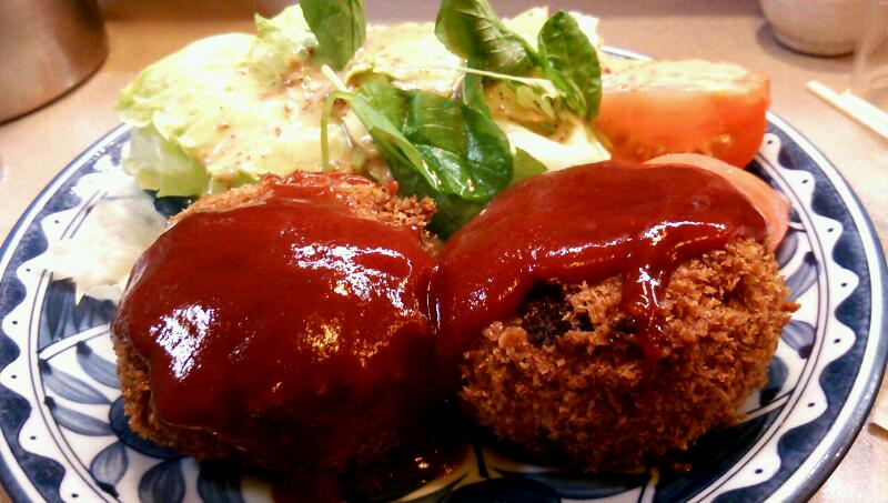 この牡蠣フライもおいしかった。コロッケの上にかかってるのも、これもケチャップではなくて、ケチャップベースのオリジナルソースでしょうね。味が強すぎず、やわらかいやさしい味。すごく素材と、揚げ方をいかしたソースです。