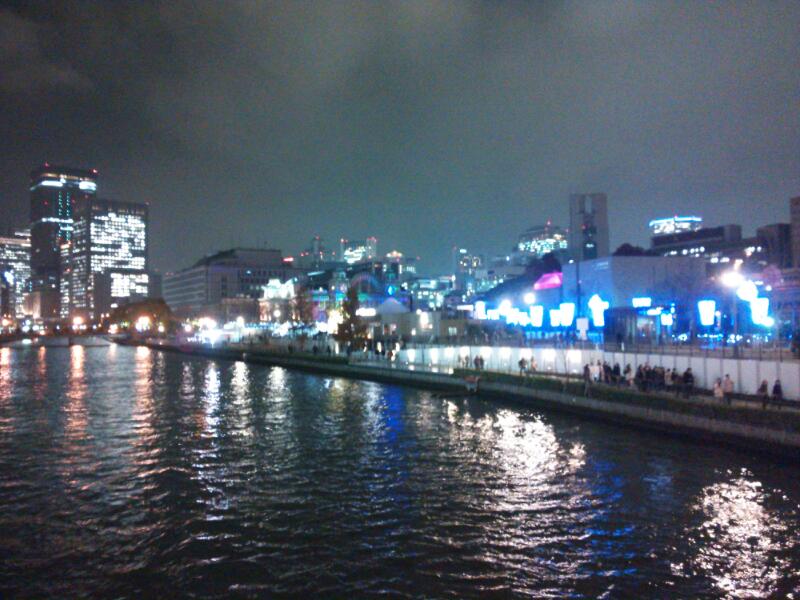 そして、橋のライトアップが綺麗!!と思ったら、その先に放水と、でっかいアヒルが!!