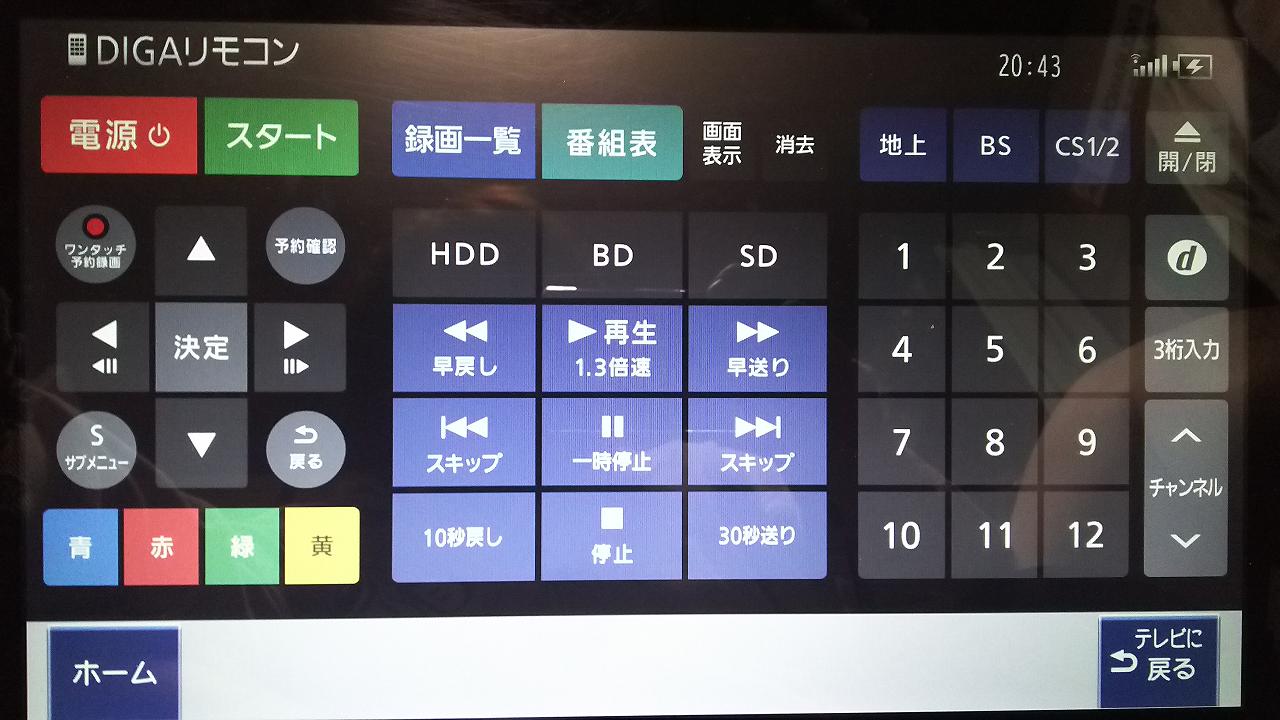 ホーム画面で「DIGAリモコン」を選べば、リモコンとしてディーガを操作することもできます(フリック操作はできません)。