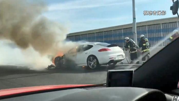 25日、阪神高速道路でポルシェがトラックに追突、炎上