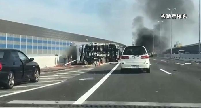 現場は片側3車線の直線道路。高速隊は詳しい事故原因を調べる。事故の影響で、尼崎西インターチェンジ(IC)-姫島IC間の上り線が一時通行止めとなった。