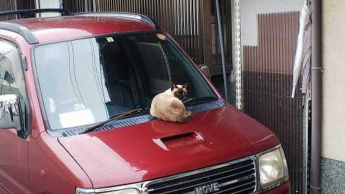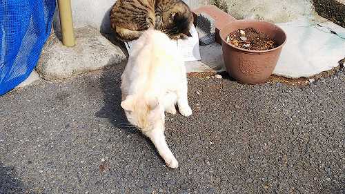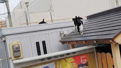 で、白黒ぶちの子が来て、屋根の上に上がって行くなあ。。