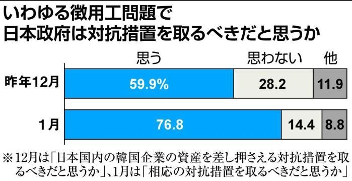 徴用工訴訟で敗訴が確定した新日鉄住金側の資産が差し押さえられる前に実施した昨年12月の前回調査では「日本国内の韓国企業の資産を差し押さえる対抗措置を取るべきだと思うか」という質問に対して「思う」との回答は59.9%だった。今回は「相応の対抗措置を取るべきだと思うか」という質問に対し「思う」が76.8%に達した。