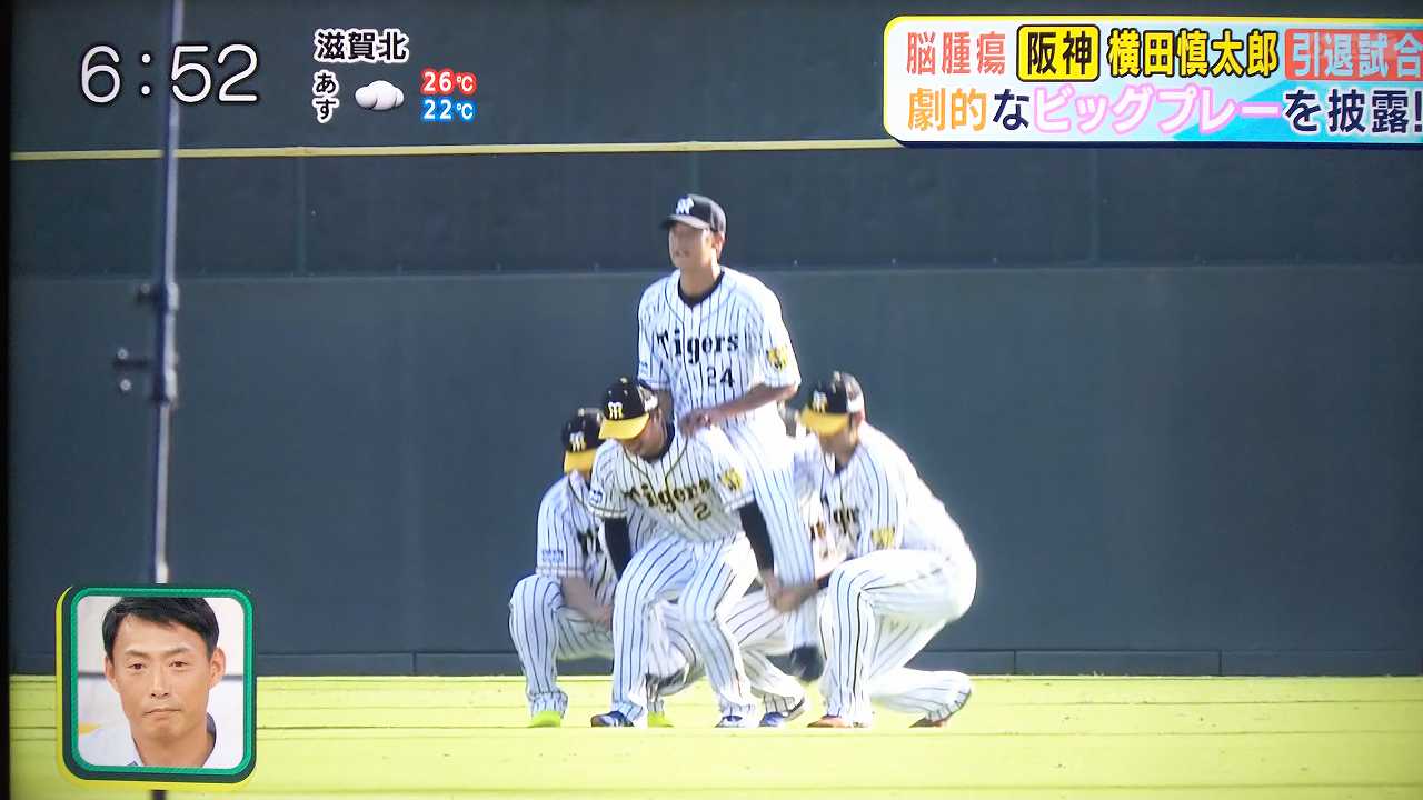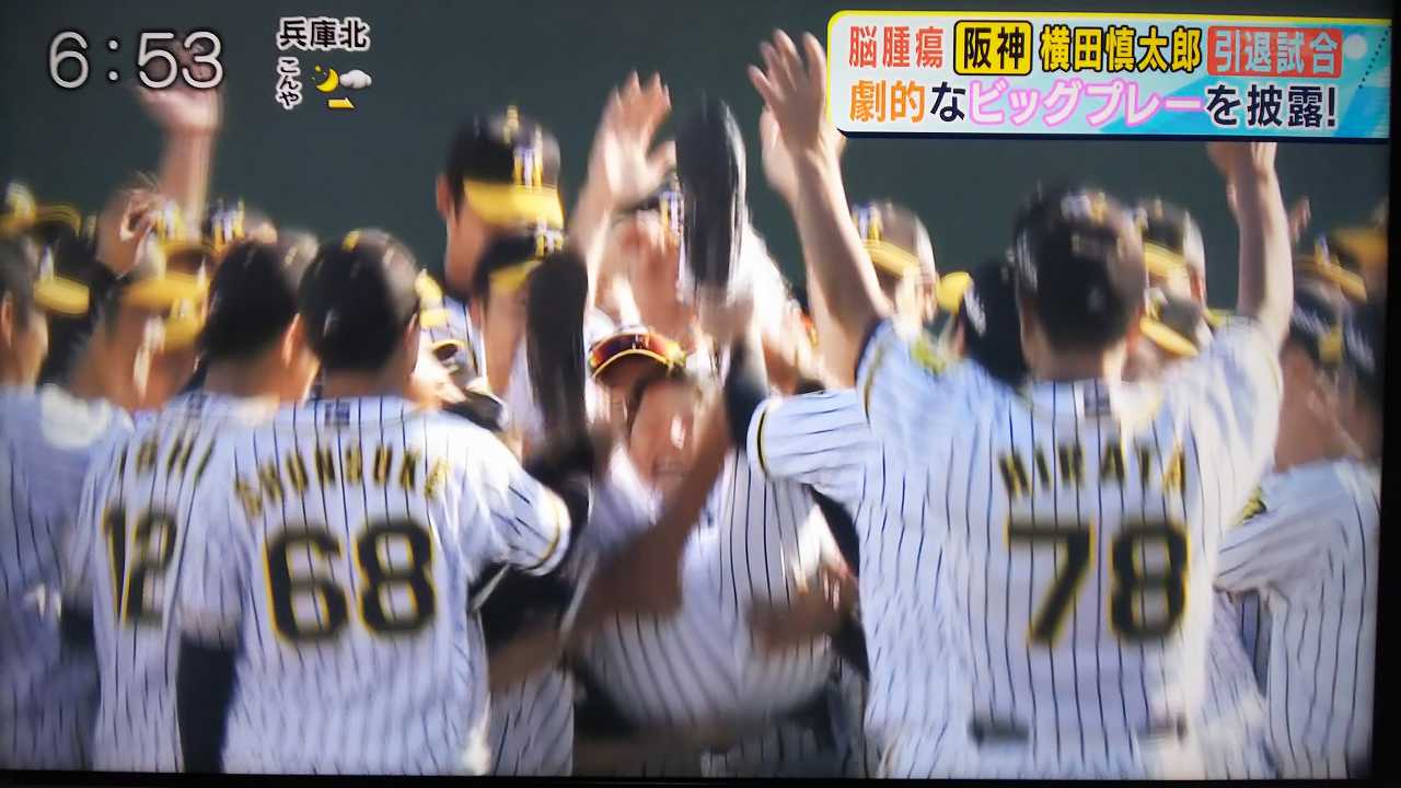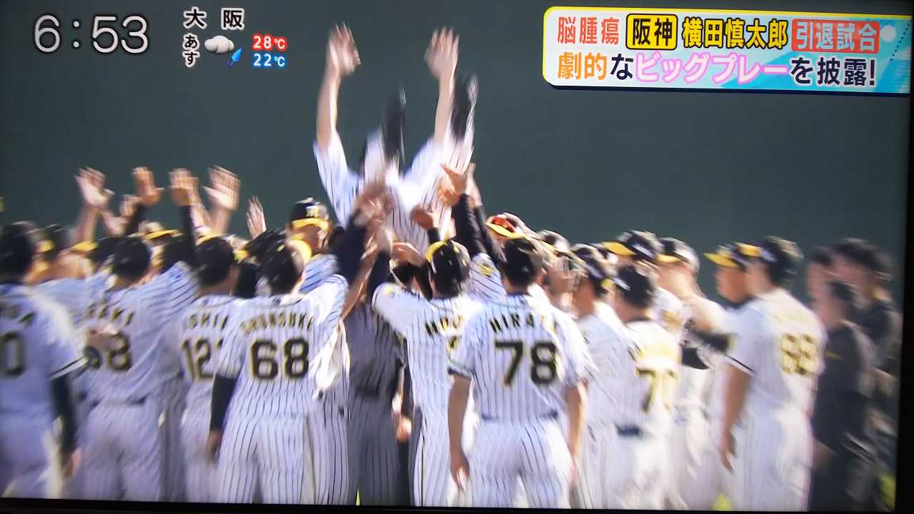 高山、北條、梅野と騎馬を組んで横田を運んだ阪神・中谷