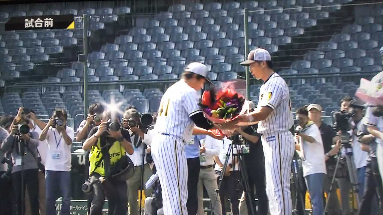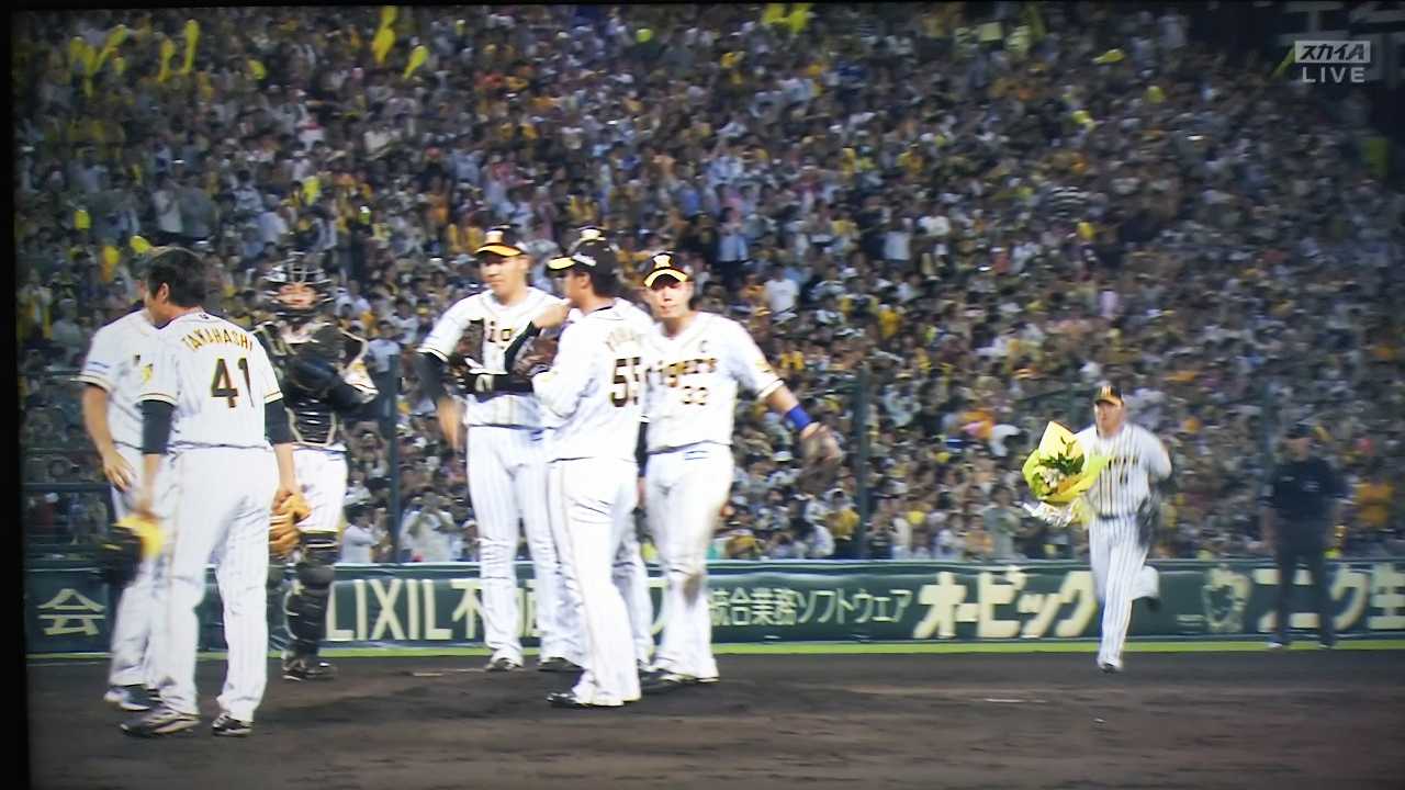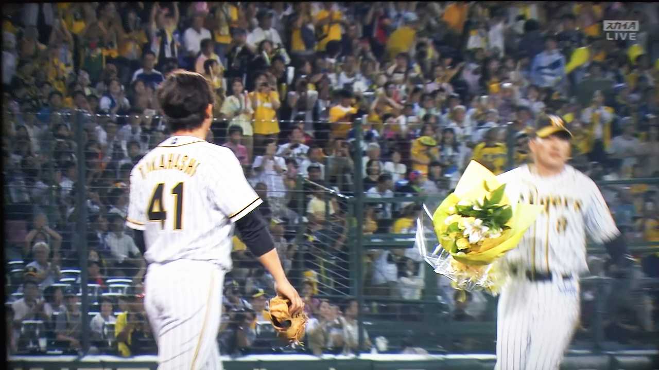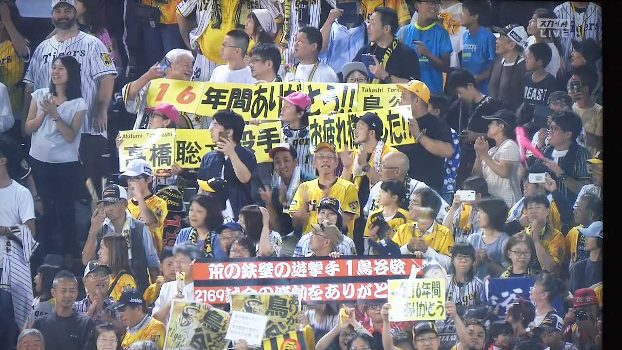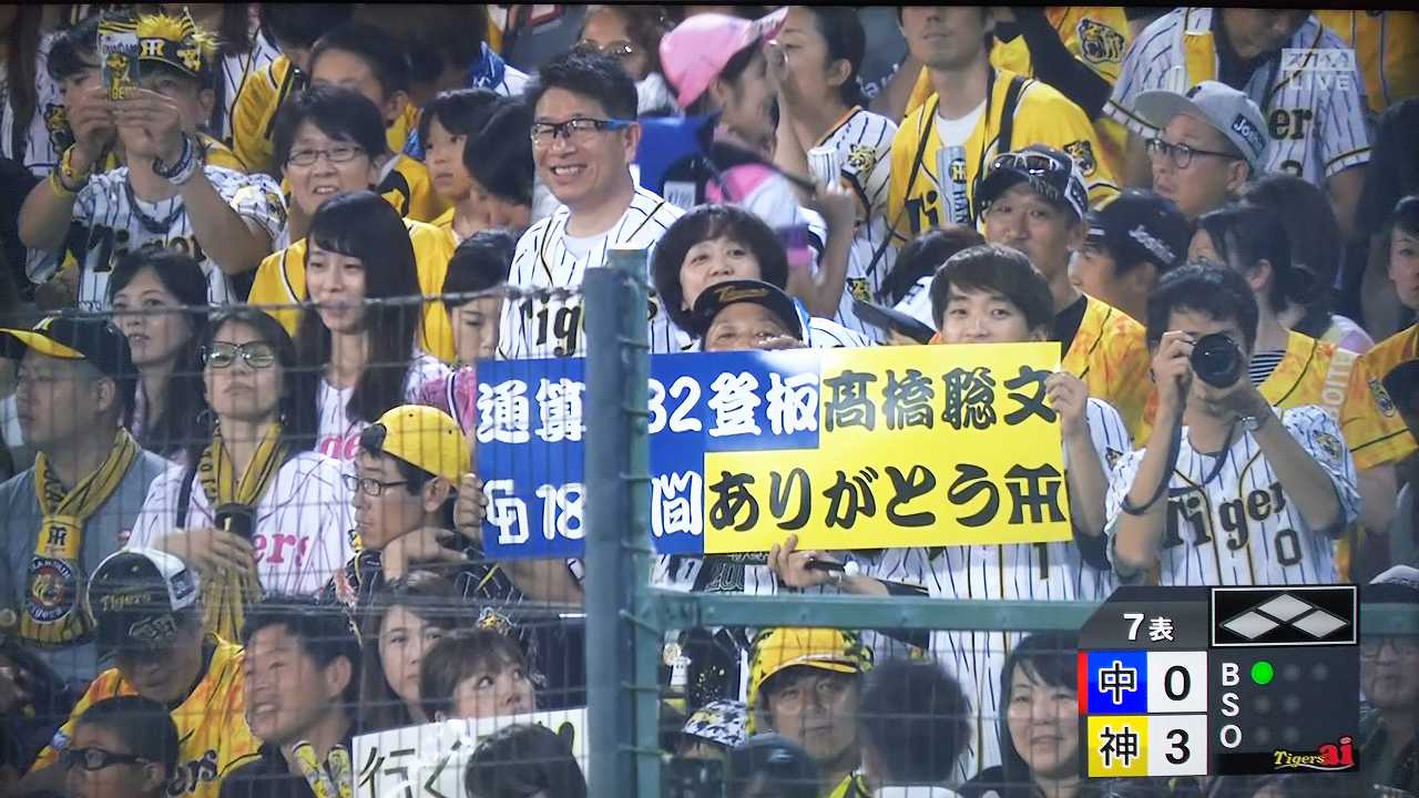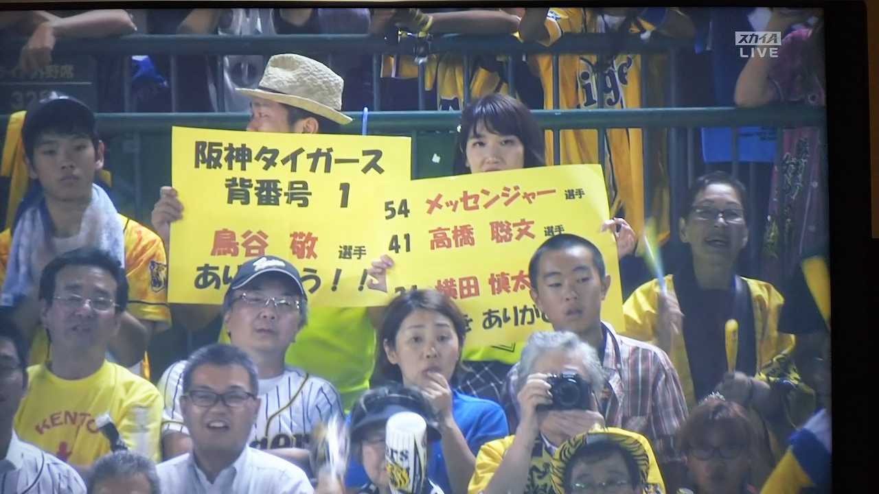 7回には今季限りでユニフォームを脱ぐ高橋聡がマウンドへ。中日の3番・福田をサードゴロに打ち取ると福留、相手先発の大野から花束を受け取り大きな拍手を浴びた。その裏の攻撃では先頭で鳥谷が打席へ。前のイニングにネクストバッターズサークルに出てくるだけで歓声が巻き起こるスーパースターは安打こそ出なかったもののショートの守備にも就きファンを沸かせた。