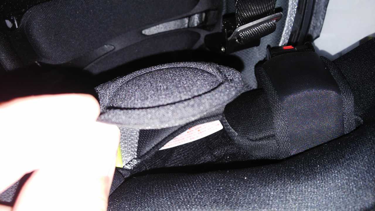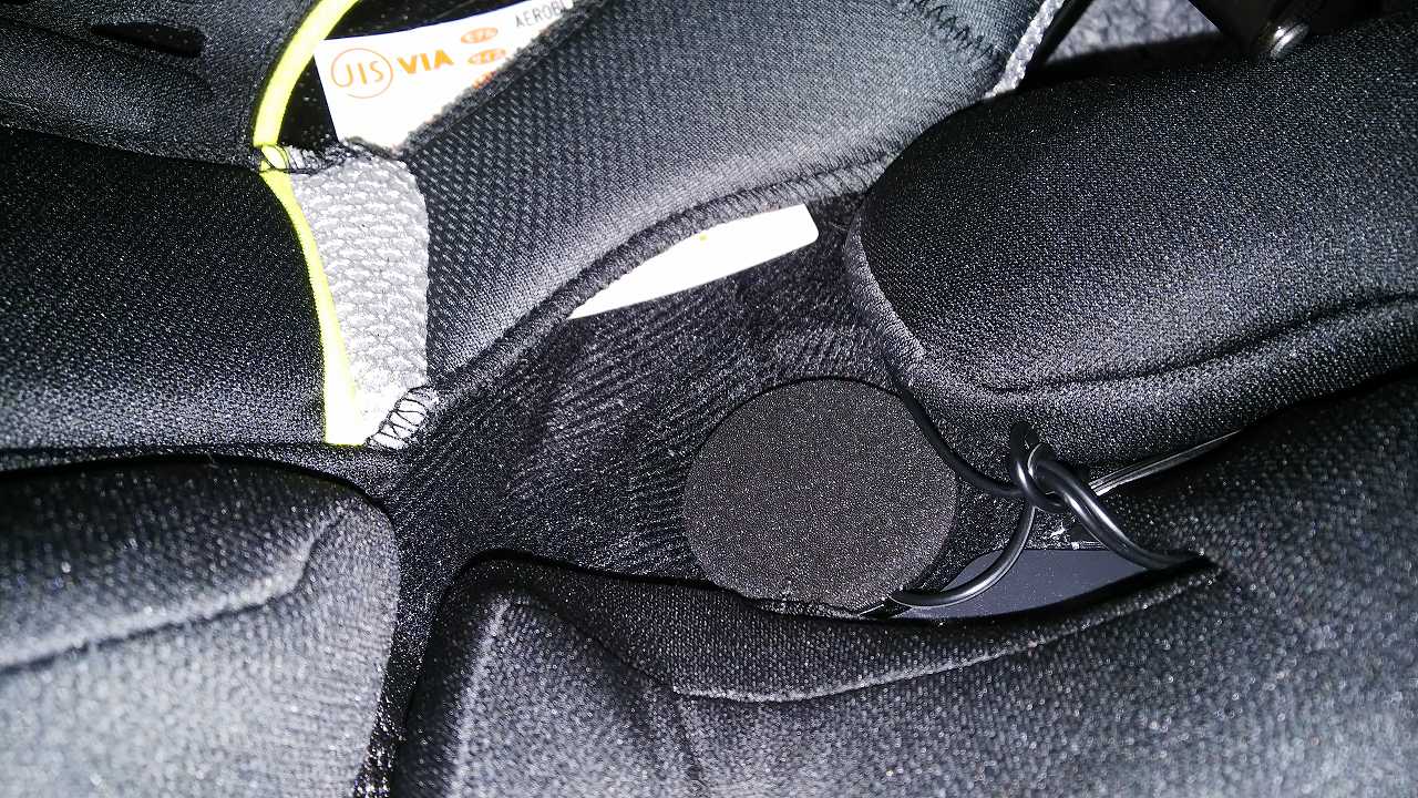 ケーブルをヘルメットのベルトに結び付け、引っ張られないようにして、あごのほうの内装のはしっこから出してやります