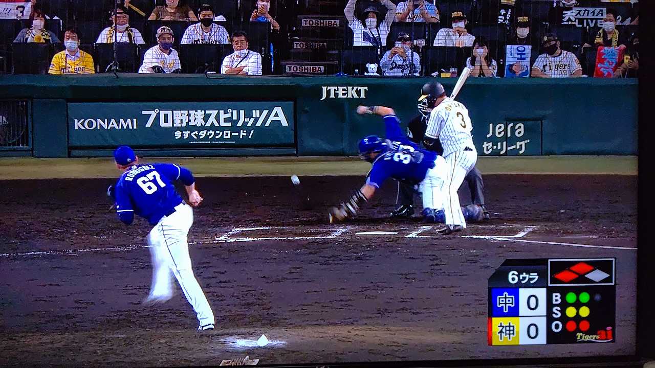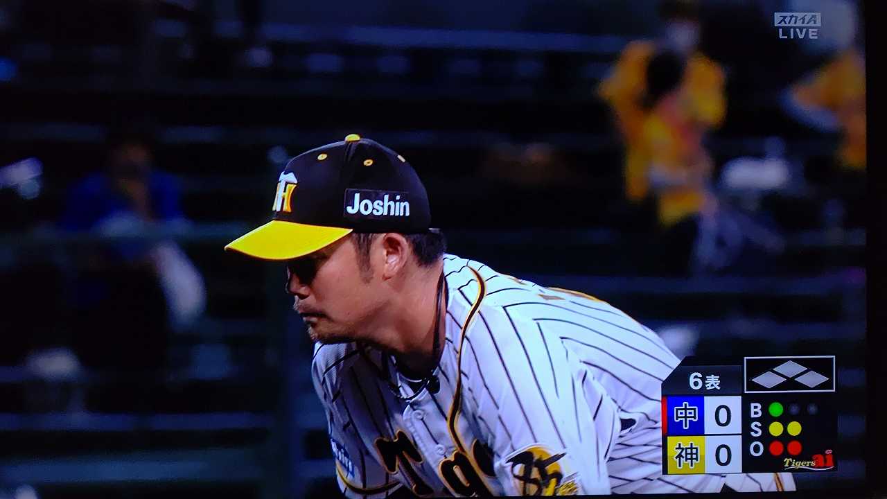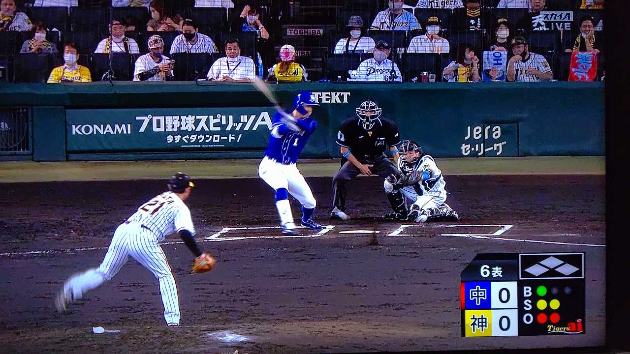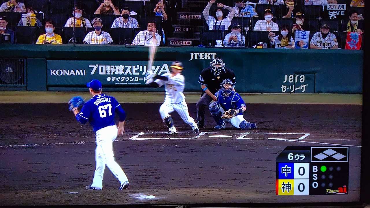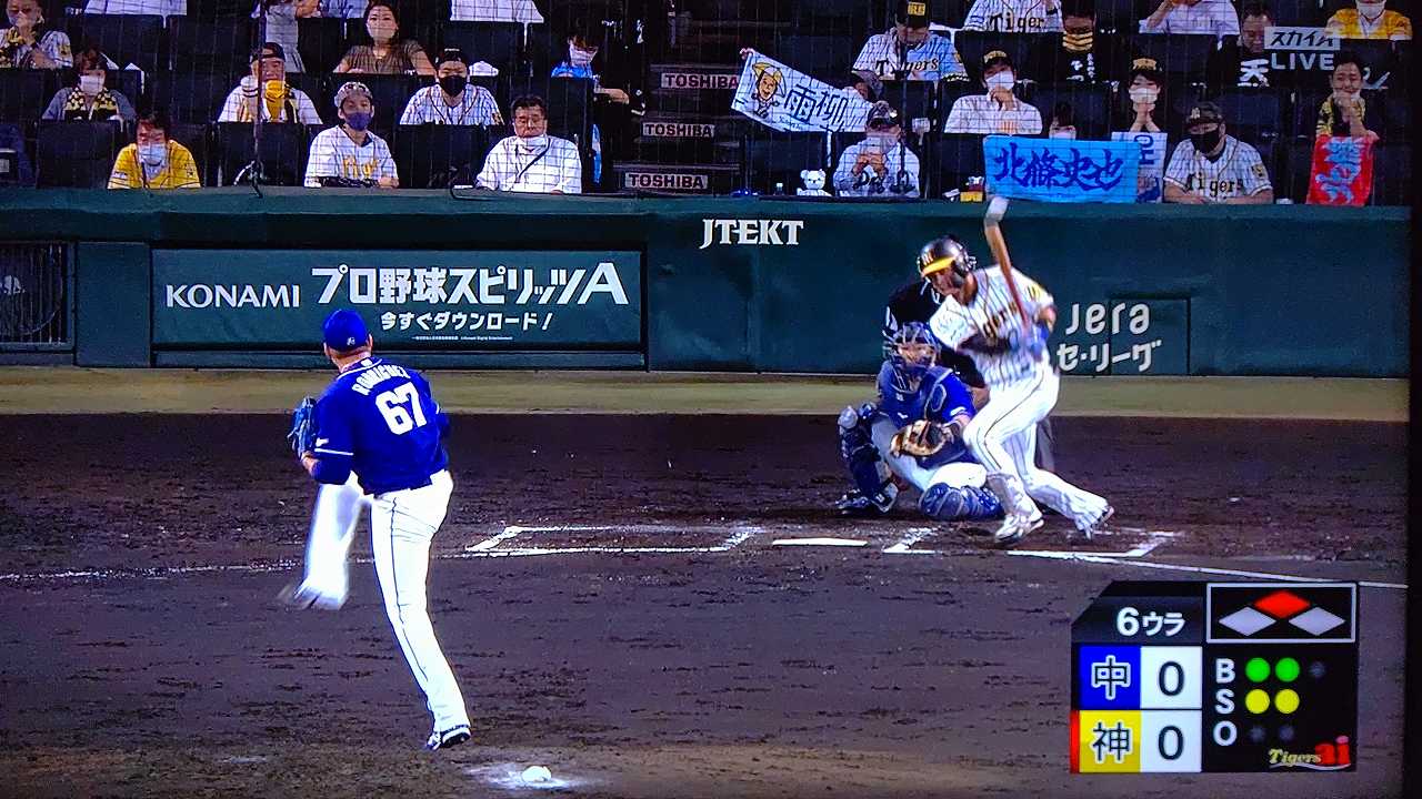 援護したい打線だが中日先発のロドリゲスを捉えられない。5回まで糸井の1安打のみに抑えられてしまった。試合が動いたのは6回、まずは先頭の近本が安打で出塁する。続く北條はバントの構えをしていたがバットを引く。矢野監督の出したサインは送りバントではなく盗塁だった。攻めの采配が功を奏し、無死2塁のチャンスを作った。近本は北條の放ったショートへのゴロで3塁進塁を試みるとこの走塁が相手の野手選択を誘い1、3塁。さらに北條も盗塁を決めて得点圏に進む。機動力でかき回し、相手バッテリーにプレッシャーをかけた。2死後、大山の打席で暴投があり近本が先制のホームに生還した。
