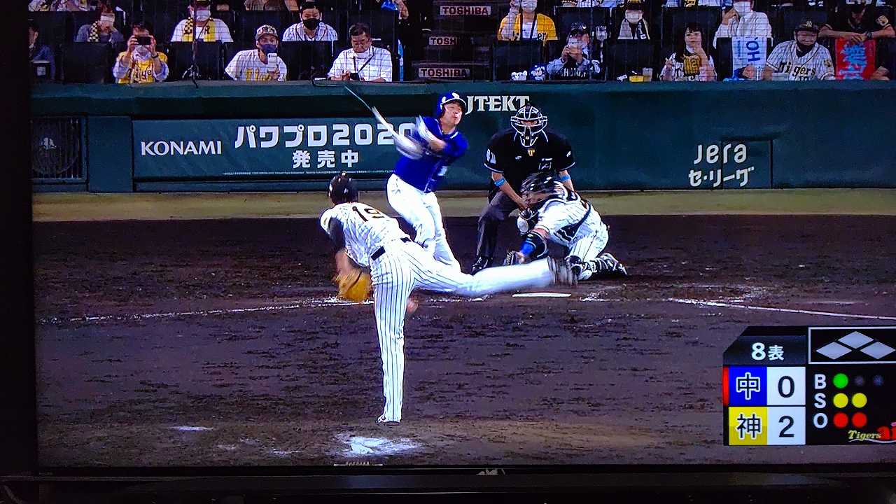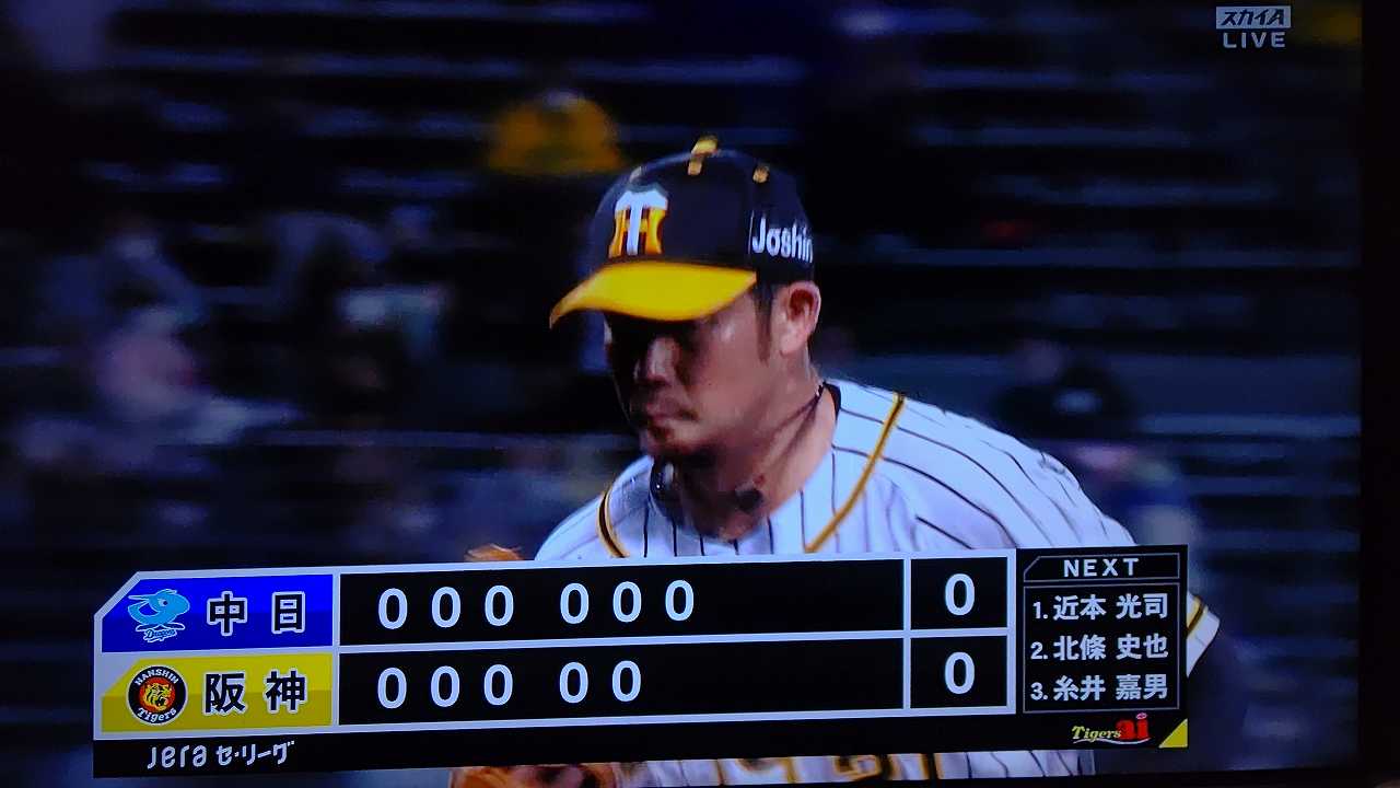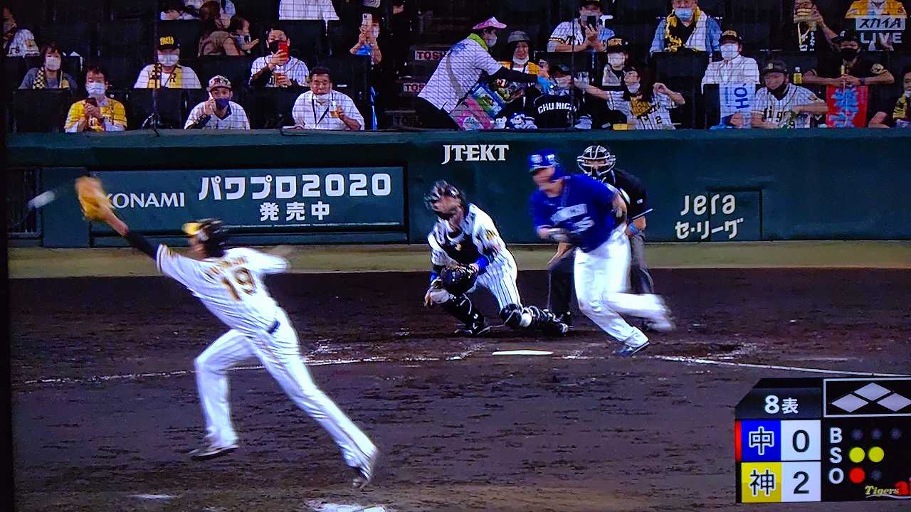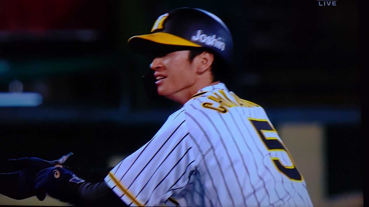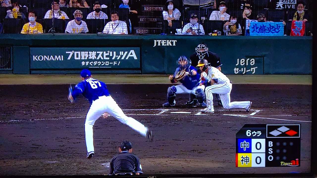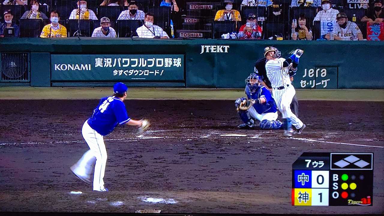 援護したい打線だが中日先発のロドリゲスを捉えられない。5回まで糸井の1安打のみに抑えられてしまった。試合が動いたのは6回、まずは先頭の近本が安打で出塁する。続く北條はバントの構えをしていたがバットを引く。矢野監督の出したサインは送りバントではなく盗塁だった。攻めの采配が功を奏し、無死2塁のチャンスを作った。近本は北條の放ったショートへのゴロで3塁進塁を試みるとこの走塁が相手の野手選択を誘い1、3塁。さらに北條も盗塁を決めて得点圏に進む。機動力でかき回し、相手バッテリーにプレッシャーをかけた。2死後、大山の打席で暴投があり近本が先制のホームに生還した。