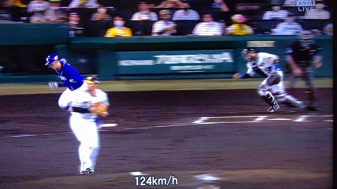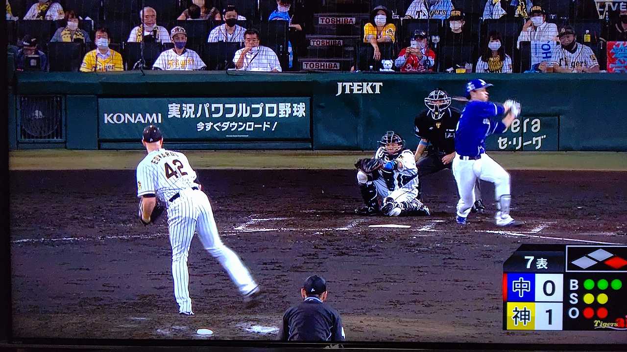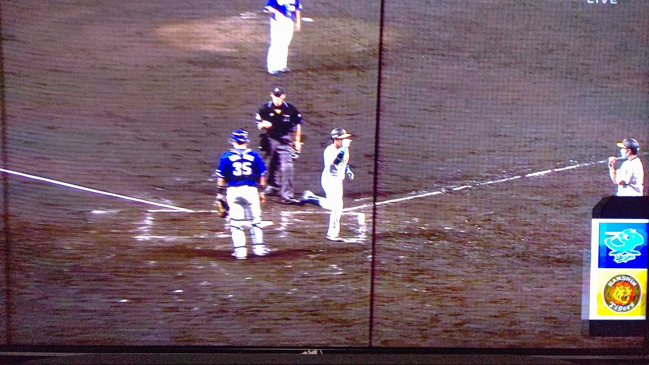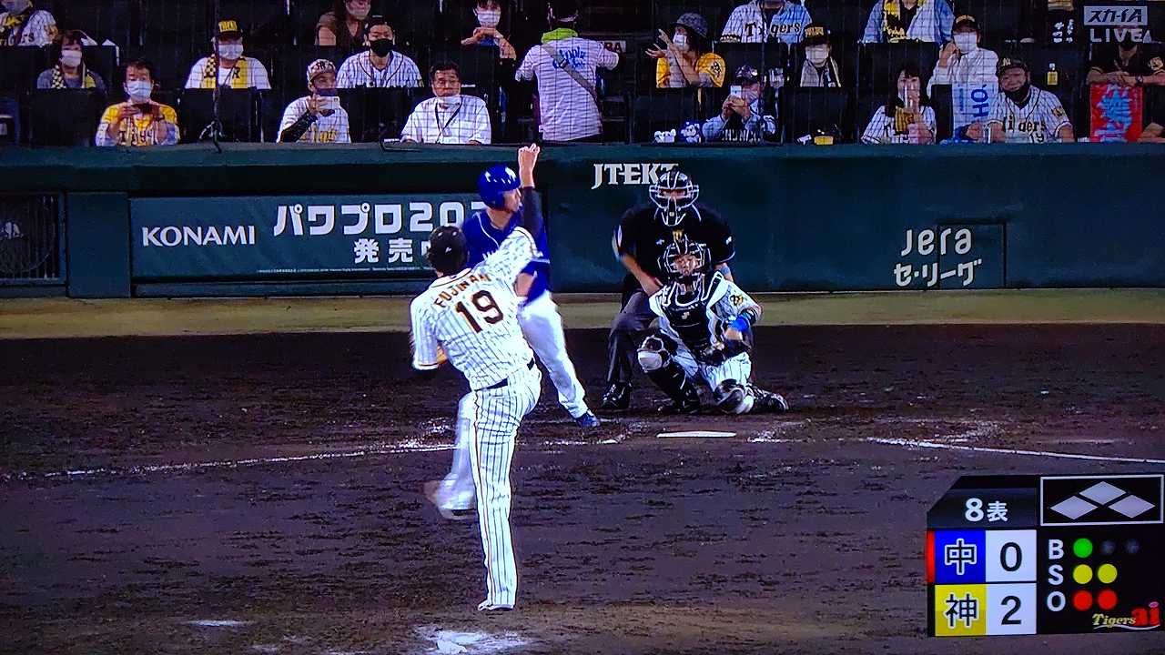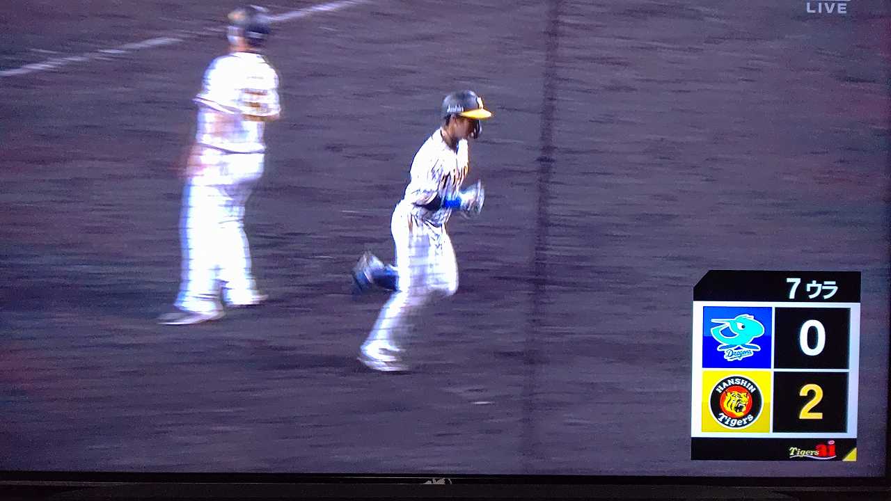 援護したい打線だが中日先発のロドリゲスを捉えられない。5回まで糸井の1安打のみに抑えられてしまった。試合が動いたのは6回、まずは先頭の近本が安打で出塁する。続く北條はバントの構えをしていたがバットを引く。矢野監督の出したサインは送りバントではなく盗塁だった。攻めの采配が功を奏し、無死2塁のチャンスを作った。近本は北條の放ったショートへのゴロで3塁進塁を試みるとこの走塁が相手の野手選択を誘い1、3塁。さらに北條も盗塁を決めて得点圏に進む。機動力でかき回し、相手バッテリーにプレッシャーをかけた。2死後、大山の打席で暴投があり近本が先制のホームに生還した。