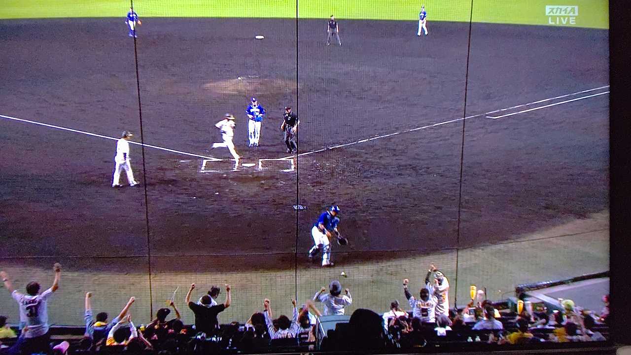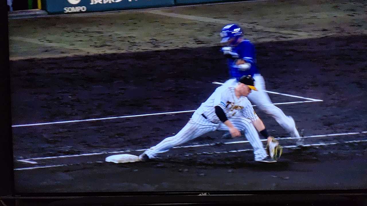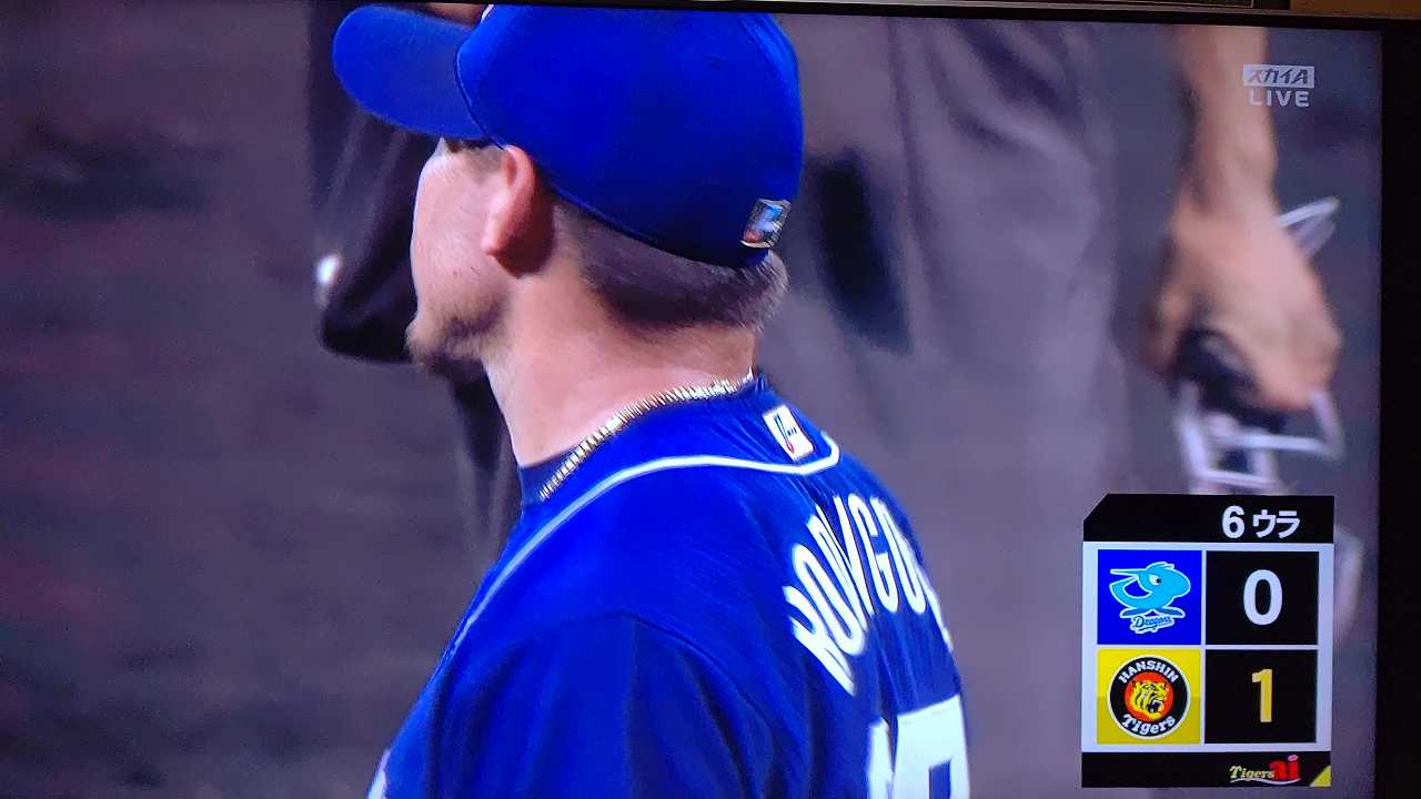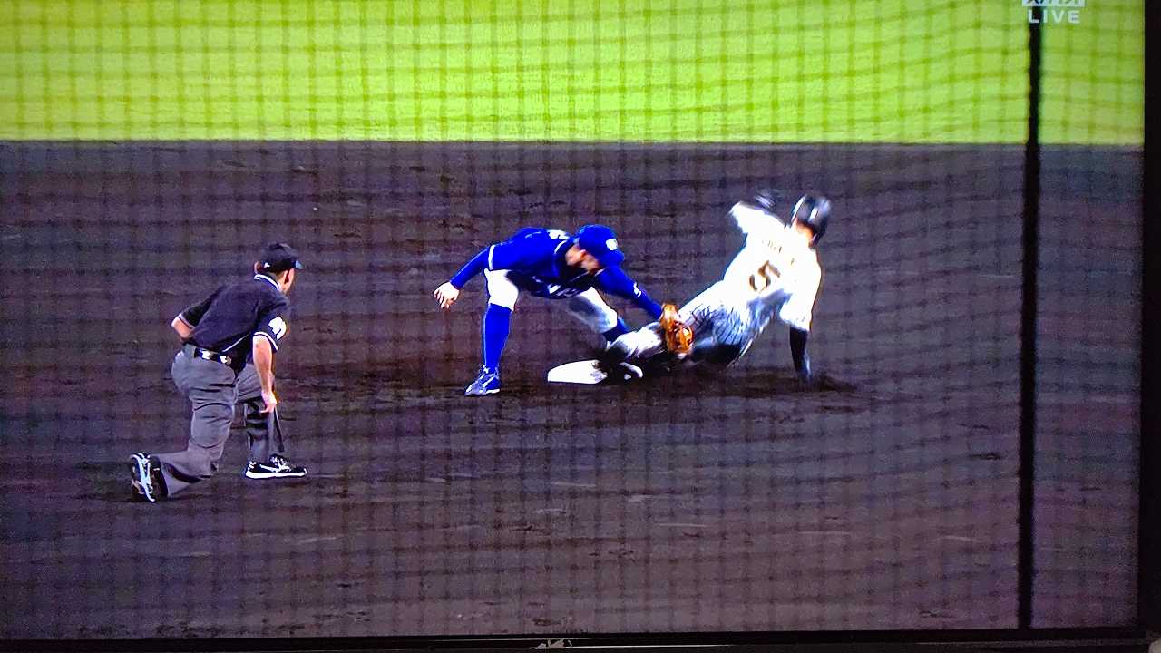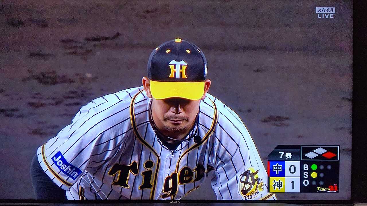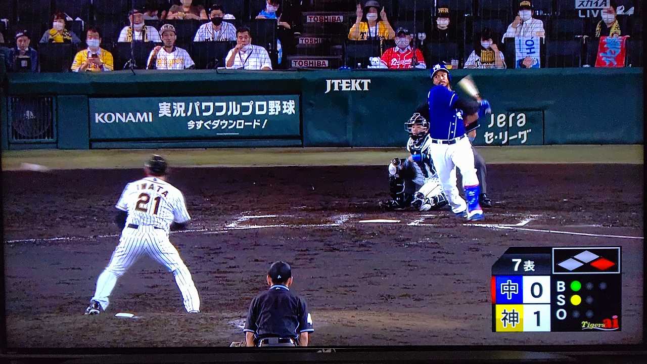 援護したい打線だが中日先発のロドリゲスを捉えられない。5回まで糸井の1安打のみに抑えられてしまった。試合が動いたのは6回、まずは先頭の近本が安打で出塁する。続く北條はバントの構えをしていたがバットを引く。矢野監督の出したサインは送りバントではなく盗塁だった。攻めの采配が功を奏し、無死2塁のチャンスを作った。近本は北條の放ったショートへのゴロで3塁進塁を試みるとこの走塁が相手の野手選択を誘い1、3塁。さらに北條も盗塁を決めて得点圏に進む。機動力でかき回し、相手バッテリーにプレッシャーをかけた。2死後、大山の打席で暴投があり近本が先制のホームに生還した。