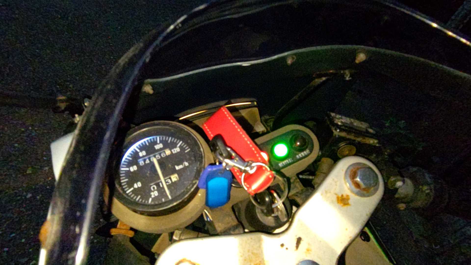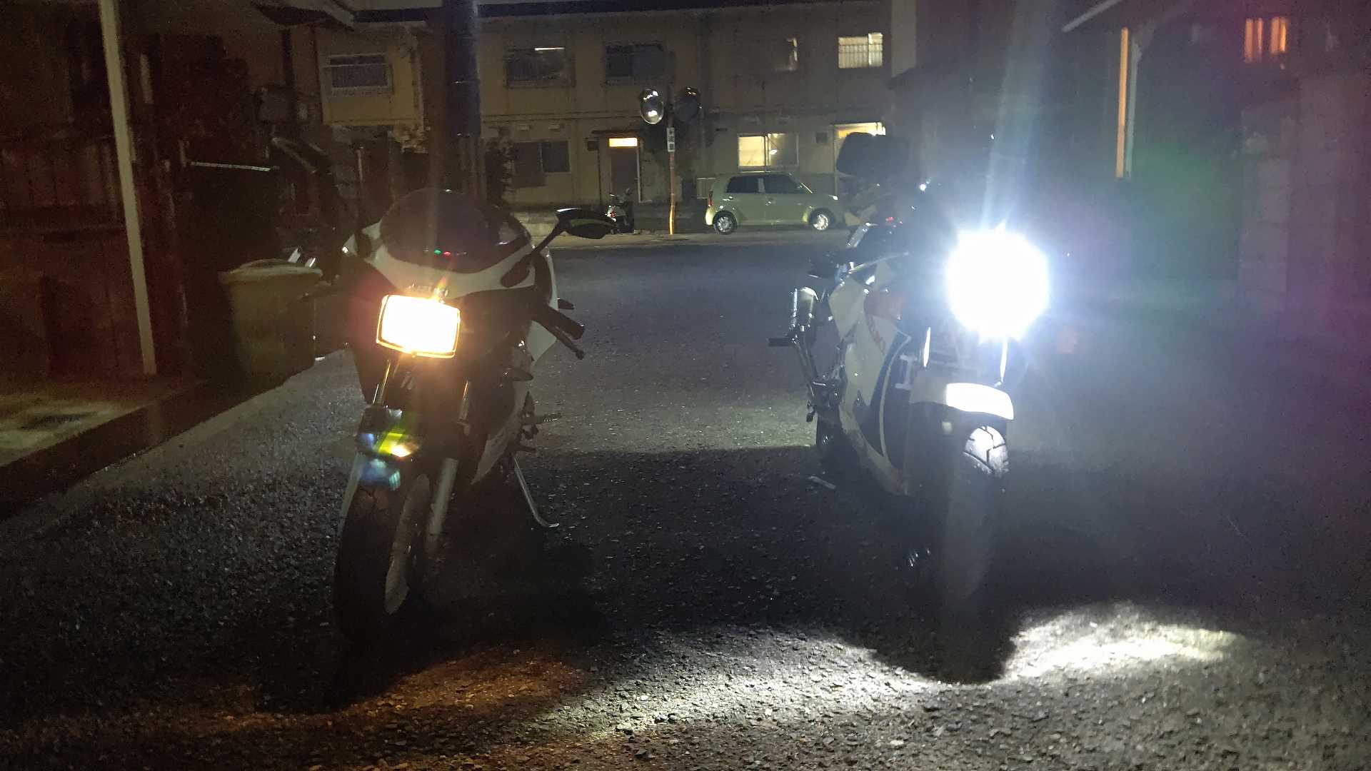 さて、暗くなってから比較に使おうと、12V化してあって、ハロゲンがついてるスコバンを、久々にエンジンかけます。。。