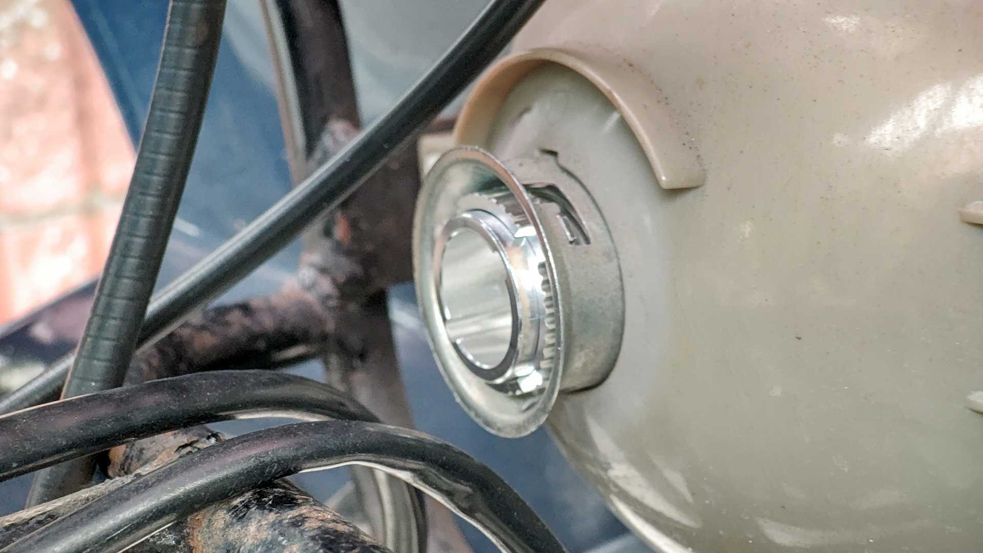 台座にバルブスプリングと、台座固定リングを取り付け、台座固定リングを回すための付属のSSTを取り付け、バイク側の上の凹に合わせて台座他を押し込み、SSTを回して、台座固定リングを回して固定します。