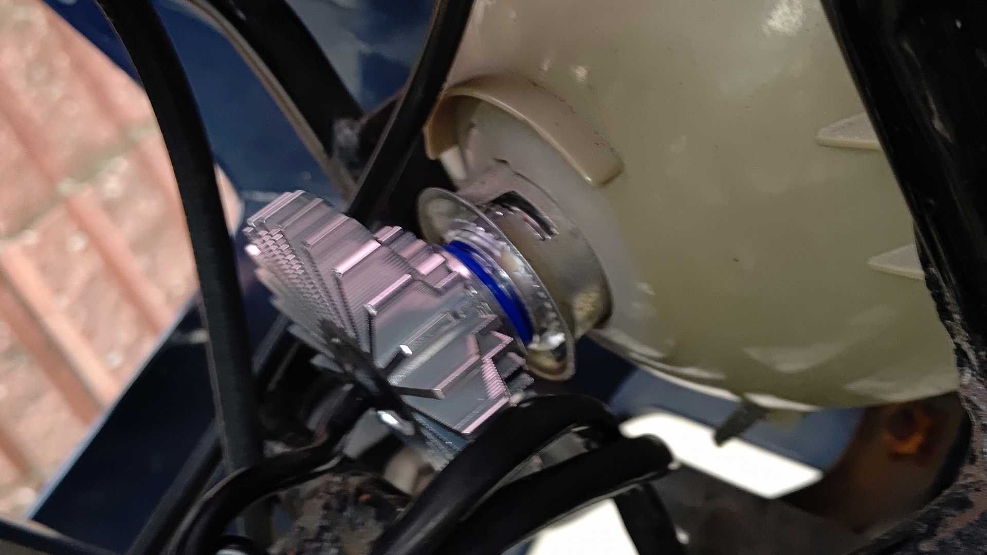 なので、イモネジ緩めた状態で、ヒートシンク回しながら、本体入れて、奥まで入ったら、イモネジ締めて、ヒートシンク押さえつけながら、二個LEDが並んでるほうを上になるように回す。。。