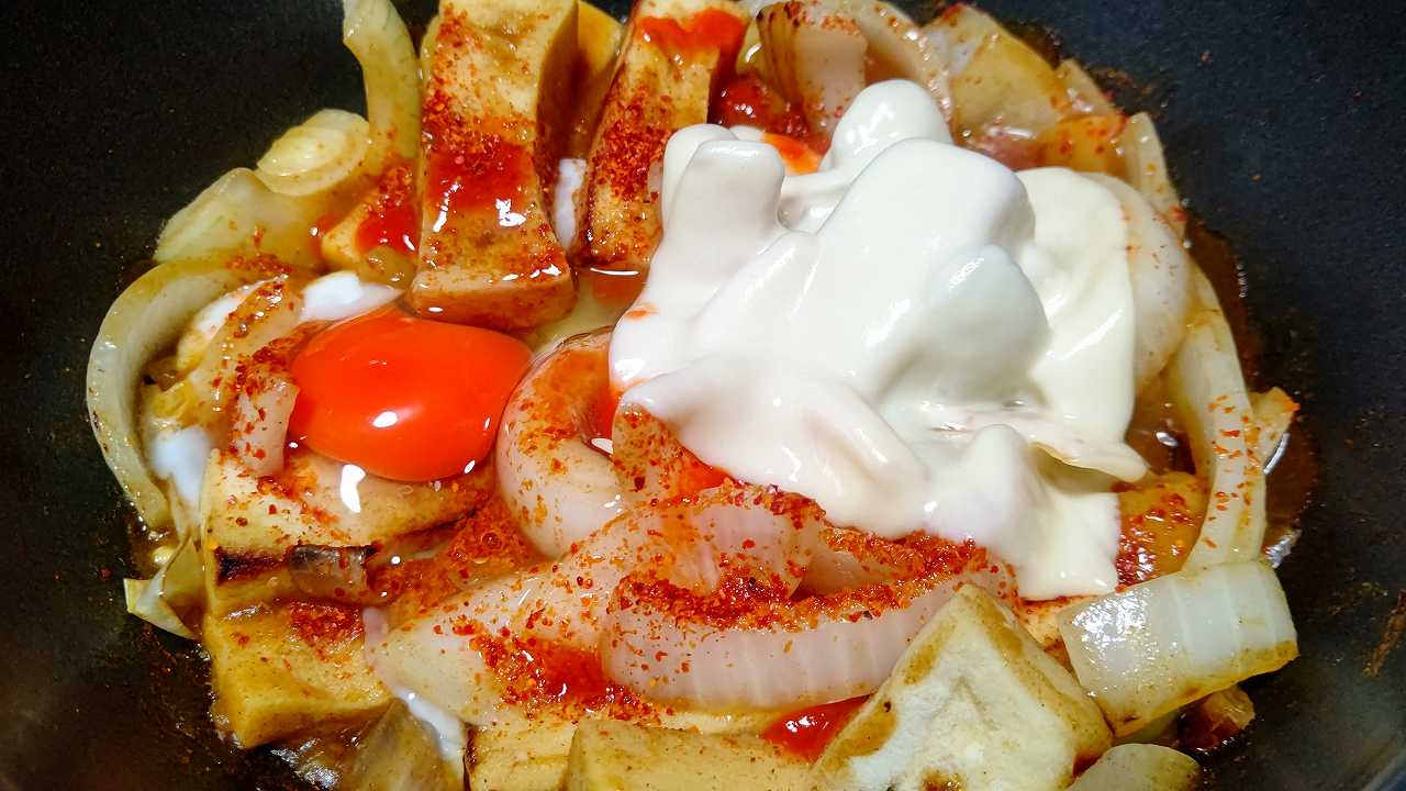 玉ねぎと、高野豆腐炒めて、スパイシーチキンカレーで焼いて