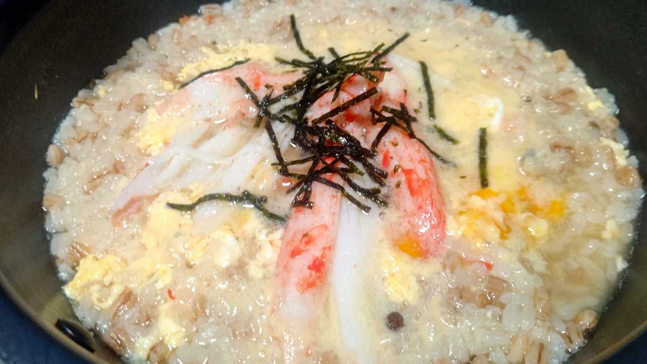 昨日作ったカニ飯(ただしカニカマ)使って、朝飯は雑炊です