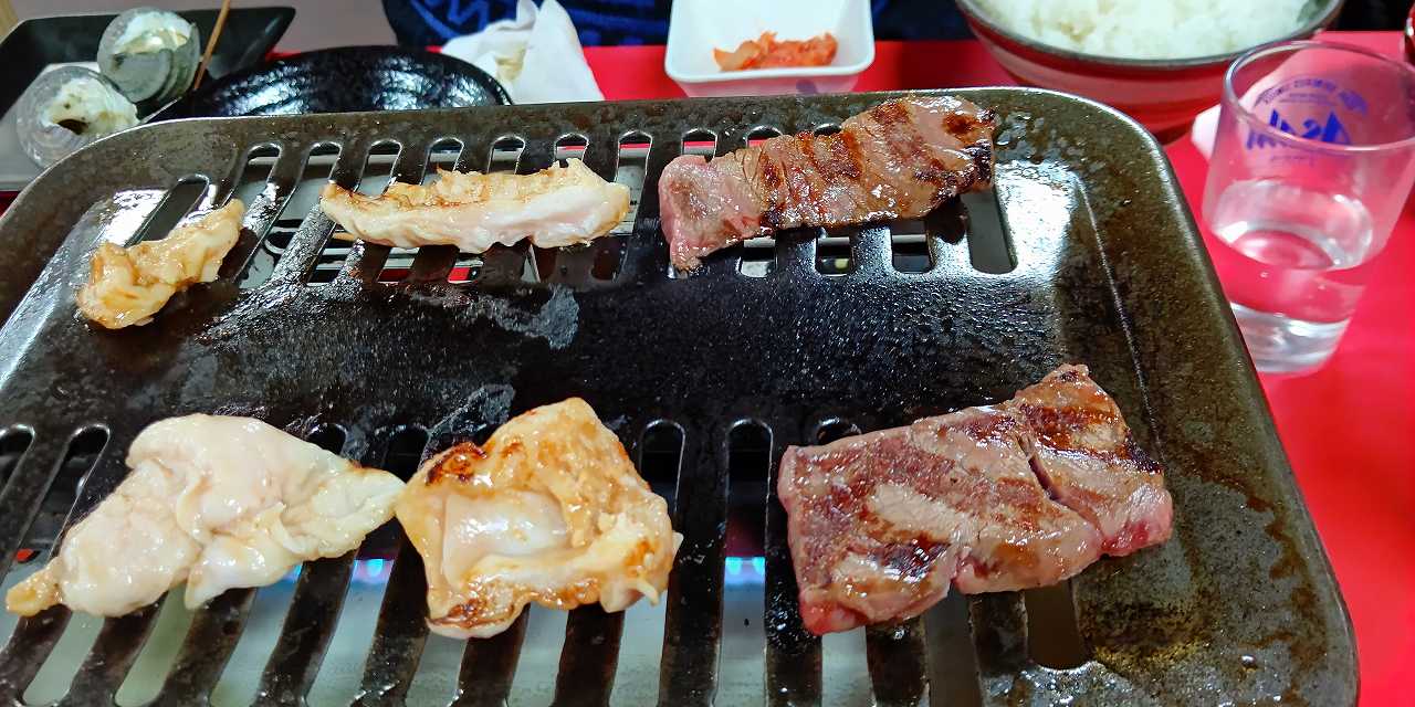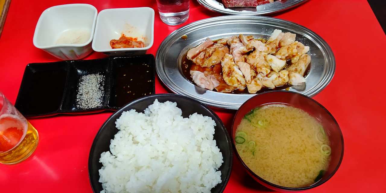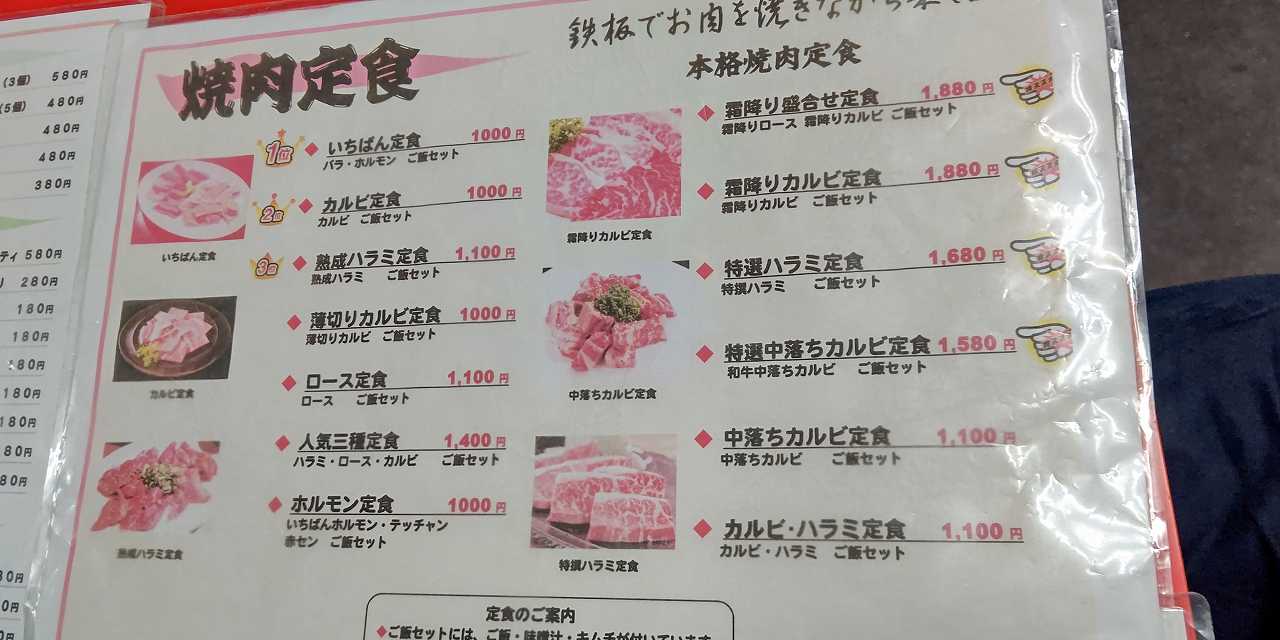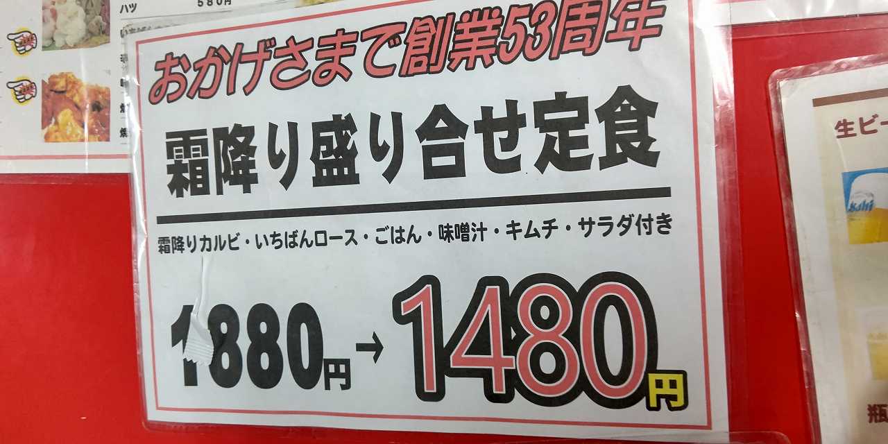 そして、53周年で安くなってる霜降り定食と、ホルモン定食を注文して、肉を半分すつに