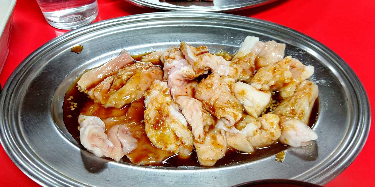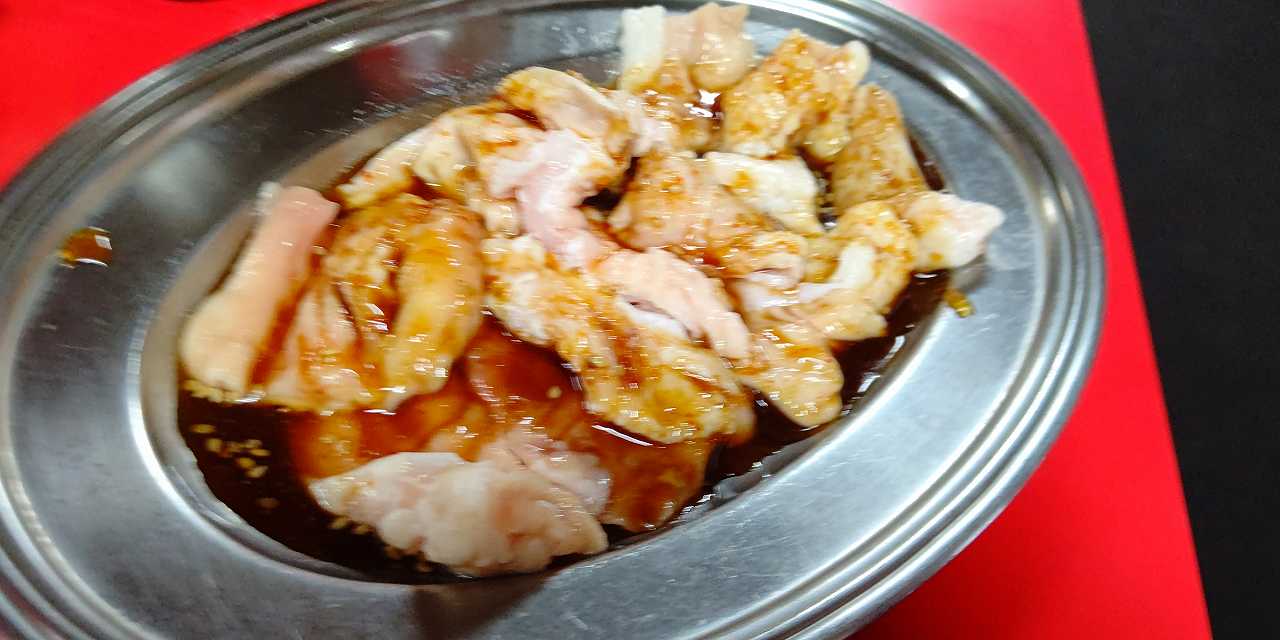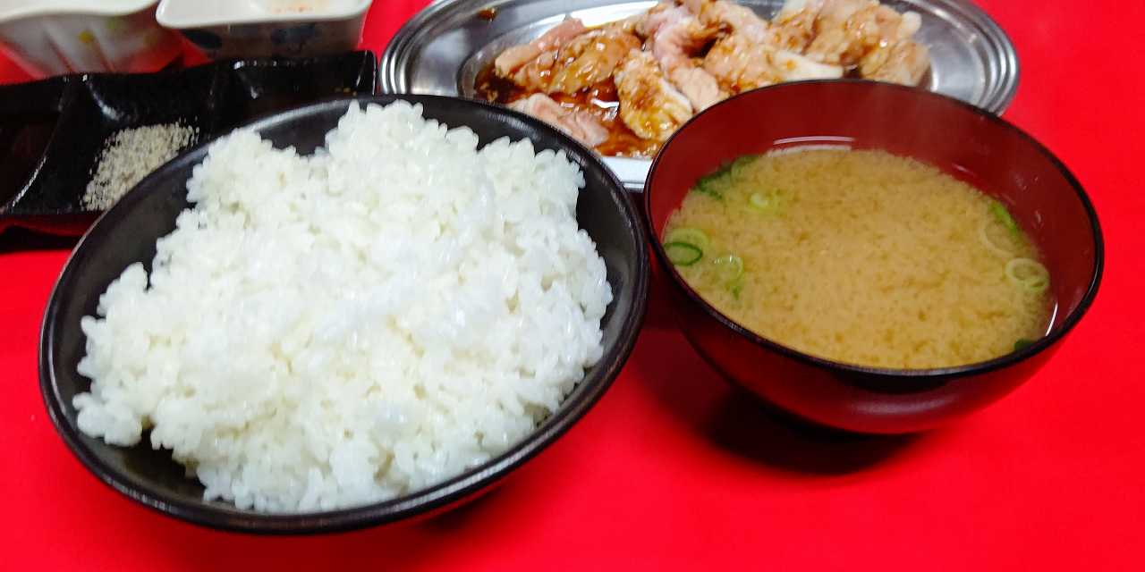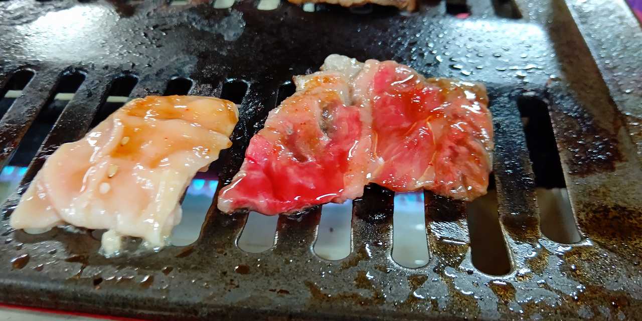 そして、53周年で安くなってる霜降り定食と、ホルモン定食を注文して、肉を半分すつに