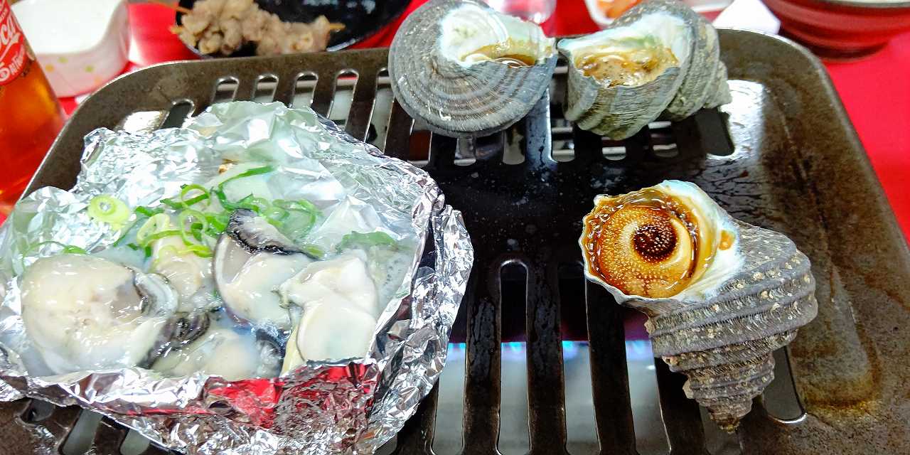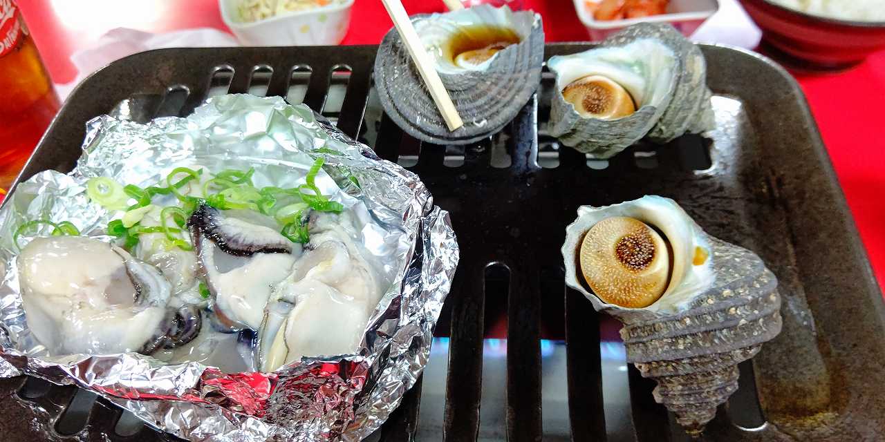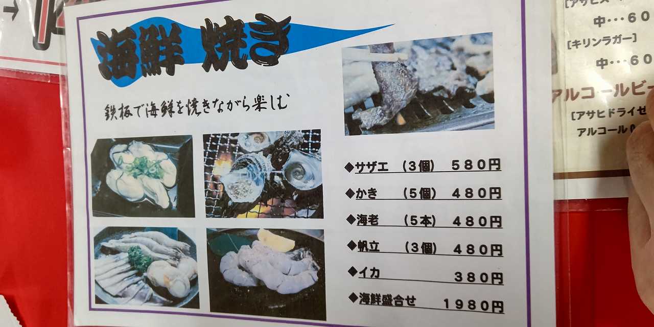 なんだ!!!牡蠣!サザエ!!海鮮もあるし、なんだこの値段は!?牡蠣五つで、480円!サザエが三つで580円!!