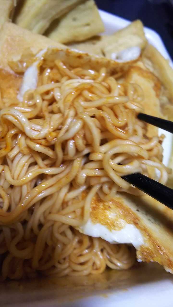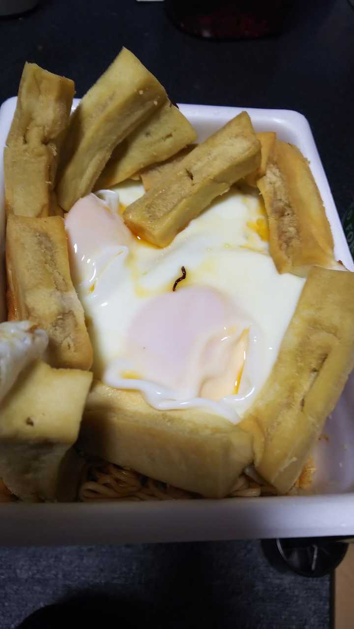 激辛MAXENDに、高野豆腐をオリーブオイルと、激辛四川ラー油で炒めたのと目玉焼き二つを。。。