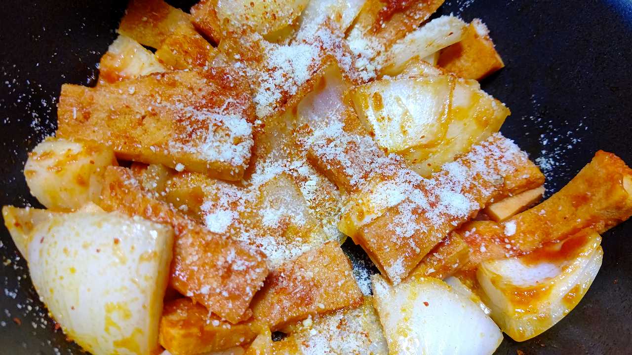 高野豆腐と新玉ねぎを、トマトジュースとオリーブオイルで炒めて、