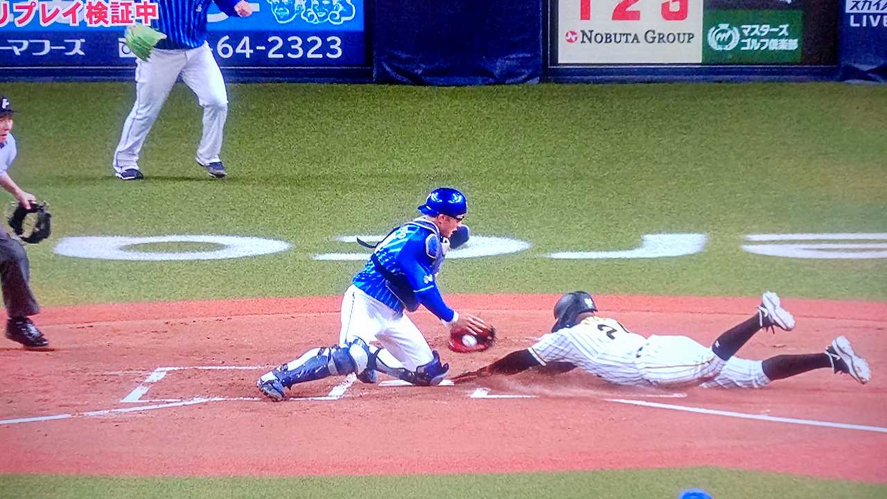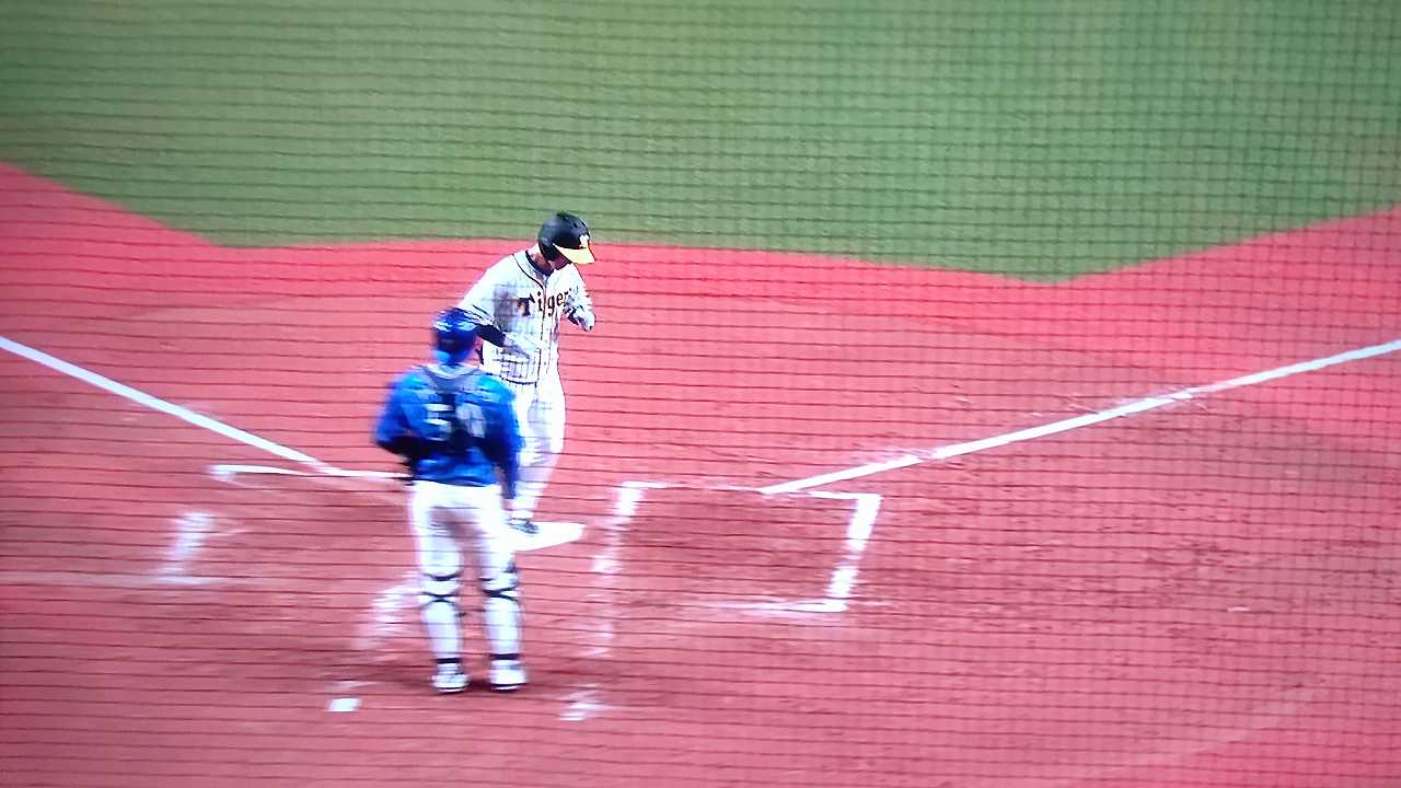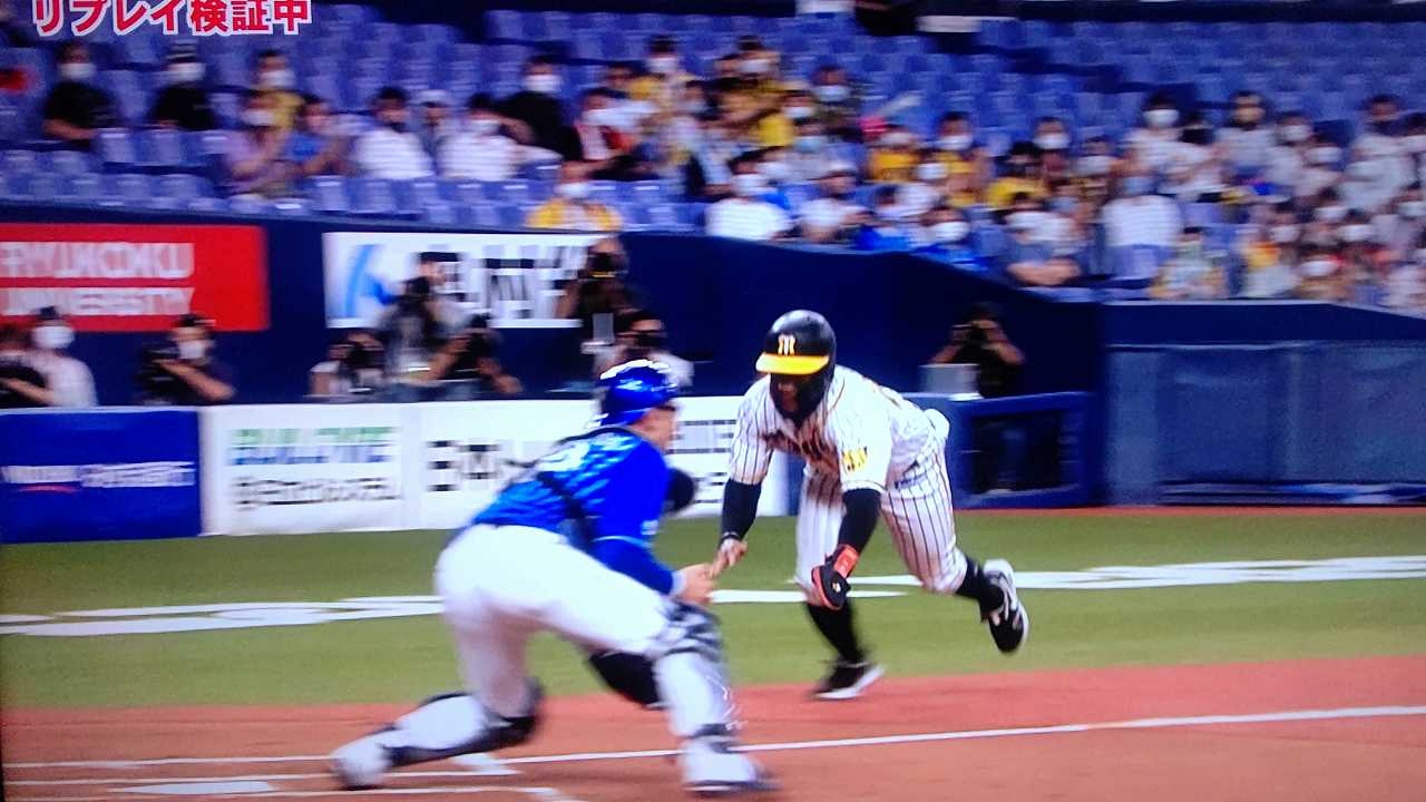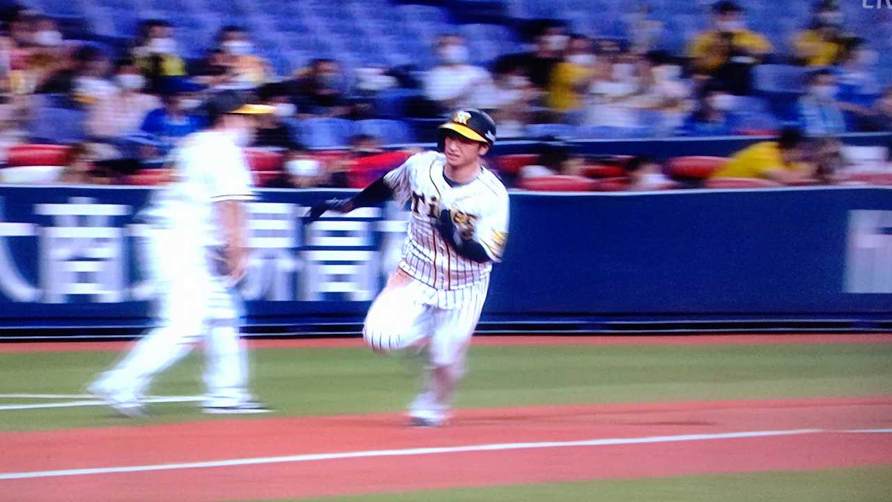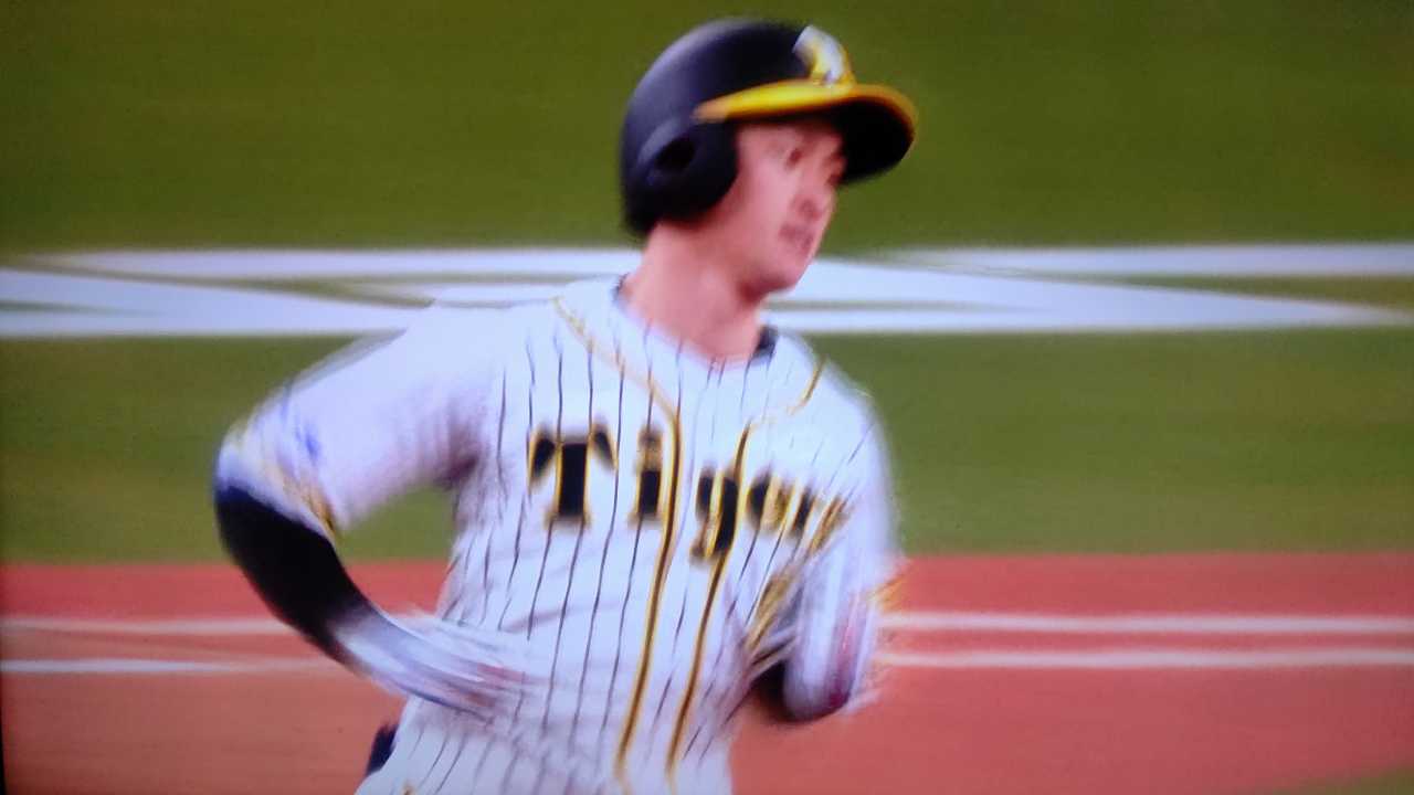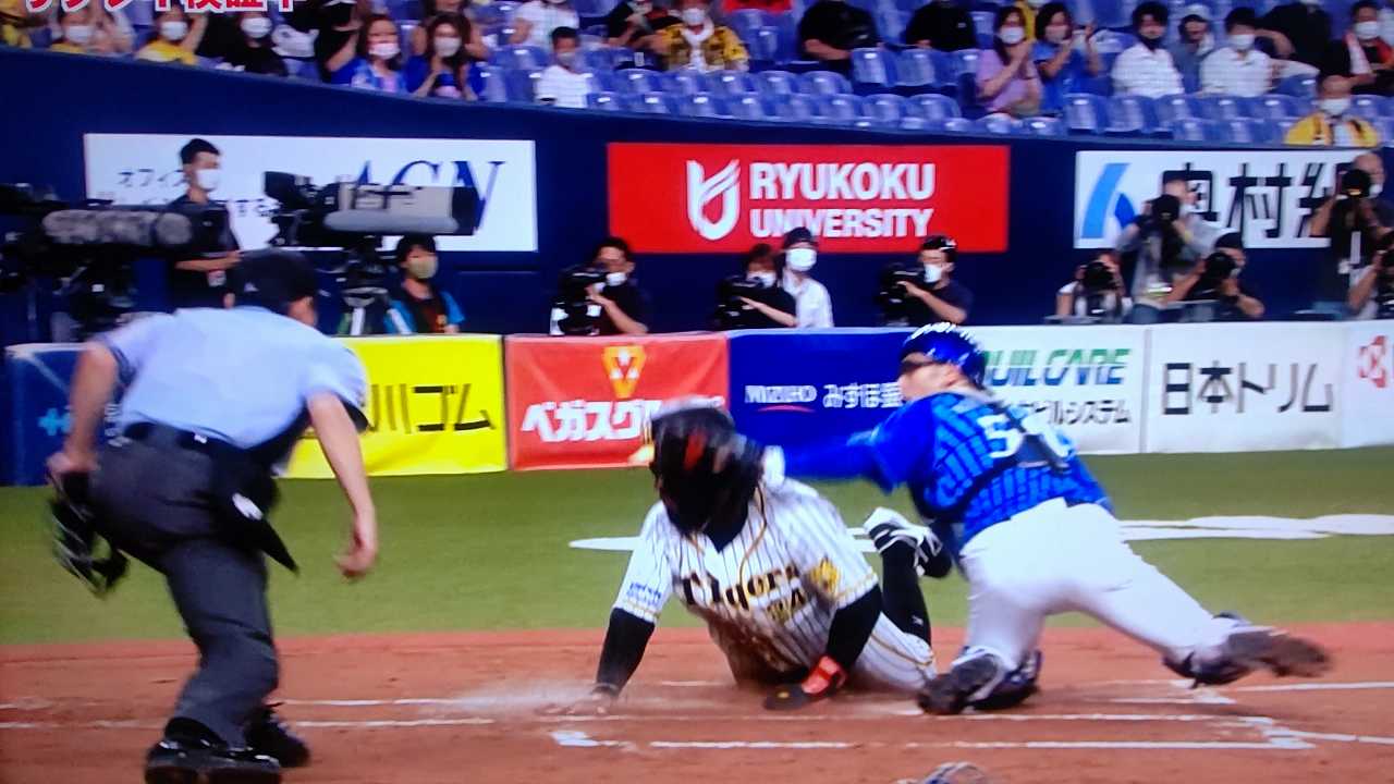 2回2死からロハス・ジュニアがレフト前に安打を放つ。続く木浪が左中間の真ん中に打球を飛ばすと、ロハス・ジュニアは激走。3塁ベースを蹴り、一直線にホーム突入を目指す。頭から滑り込んで先制のホームへ生還した。