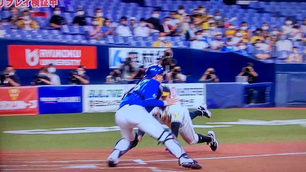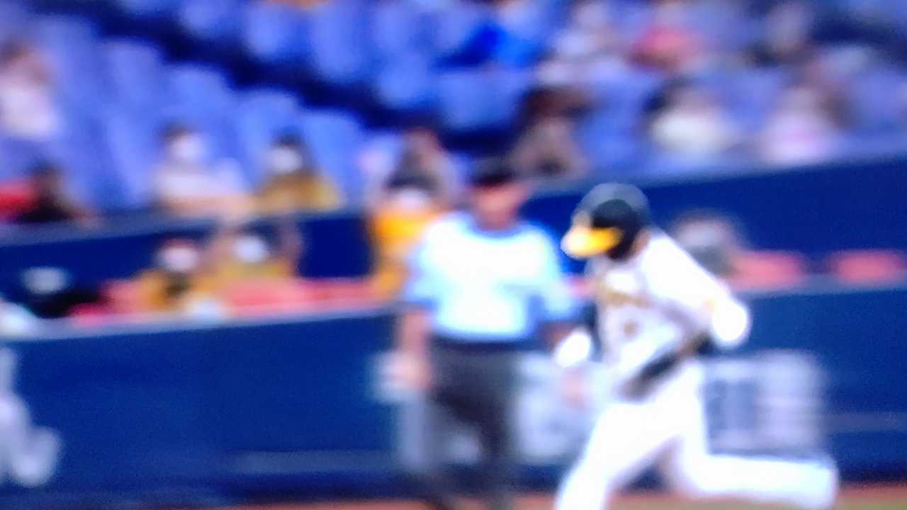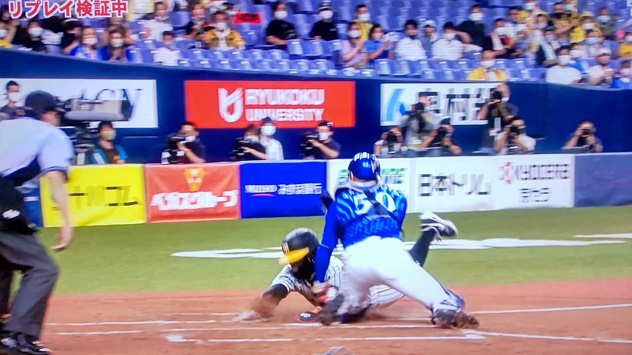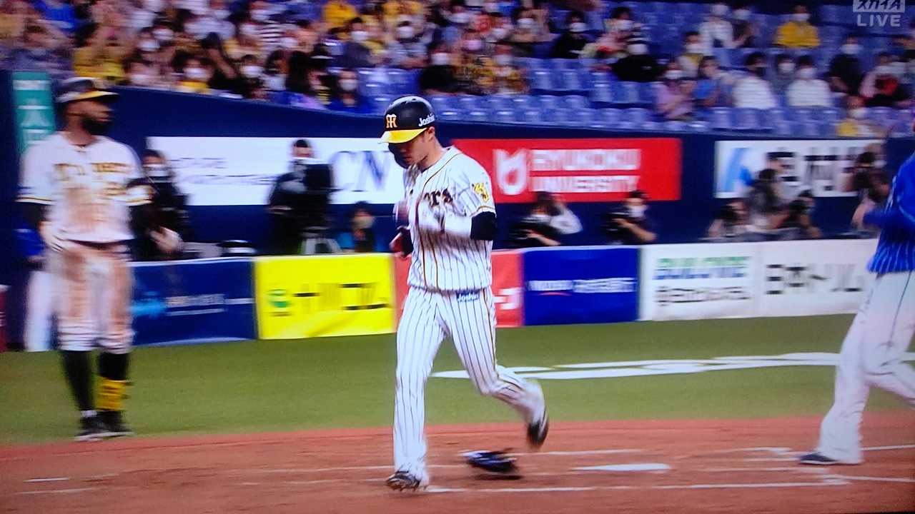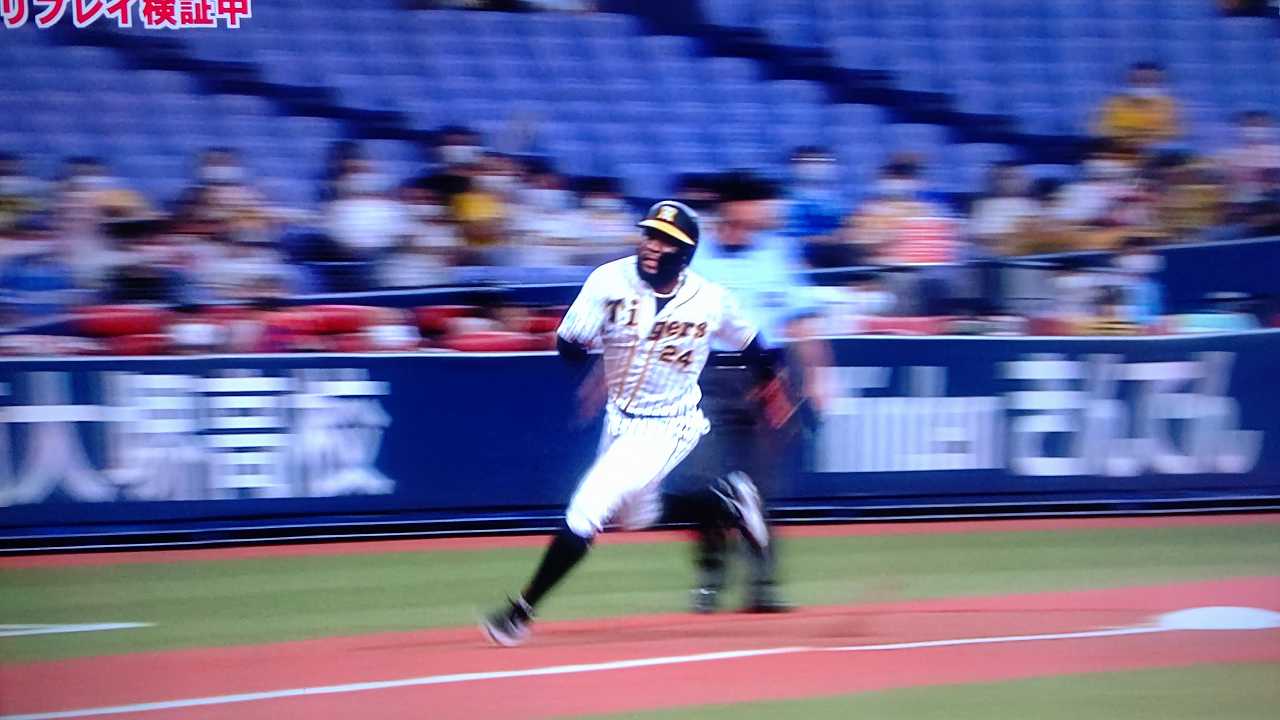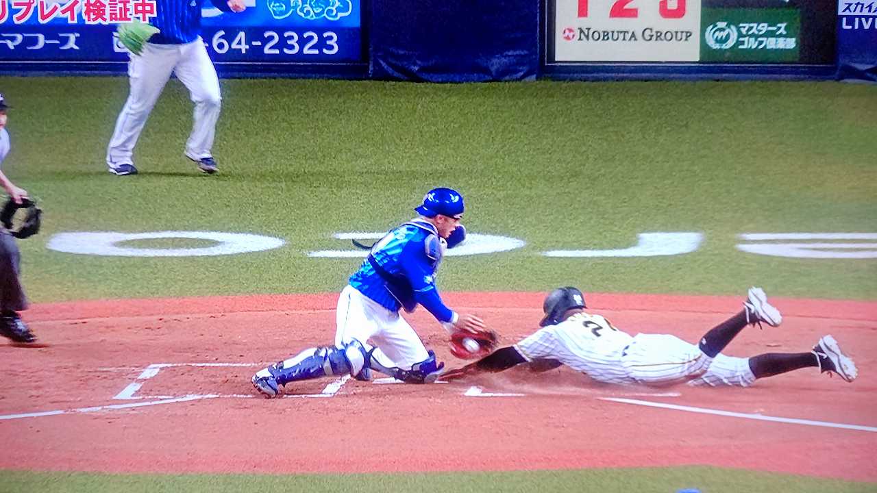2回2死からロハス・ジュニアがレフト前に安打を放つ。続く木浪が左中間の真ん中に打球を飛ばすと、ロハス・ジュニアは激走。3塁ベースを蹴り、一直線にホーム突入を目指す。頭から滑り込んで先制のホームへ生還した。