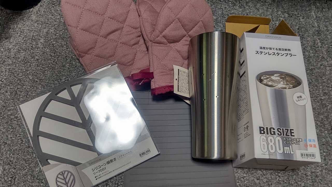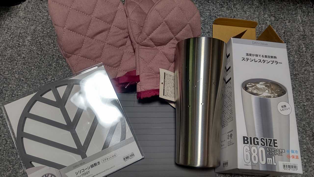 でかいタンブラーとか、シリコンの鍋敷きとか。。。
