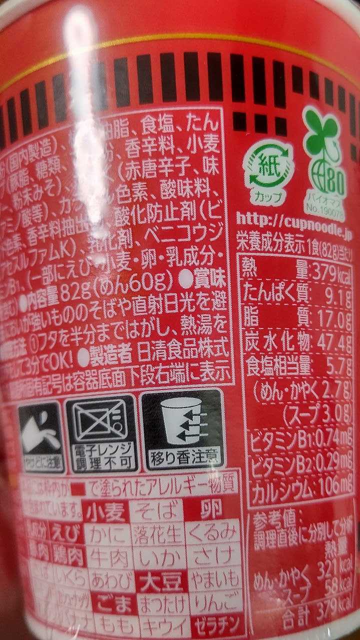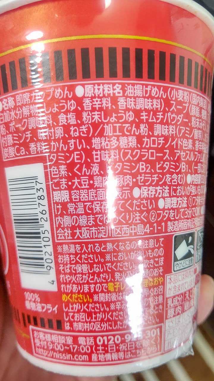 油揚げめん(小麦粉(国内製造)、植物油脂、食塩、たん白加水分解物、しょうゆ、香辛料、香味調味料)、スープ(豚脂、糖類、でん粉、香辛料、小麦粉、ポーク調味料、食塩、粉末しょうゆ、キムチパウダー、粉末みそ)、かやく(赤唐辛子、味付豚ミンチ、味付卵、ねぎ)/加工でん粉、調味料(アミノ酸等)、カラメル色素、酸味料、炭酸Ca、香料、かんすい、増粘多糖類、カロチノイド色素、香辛料抽出物、酸化防止剤(ビタミンE)、甘味料(スクラロース、アセスルファムK)、乳化剤、ベニコウジ色素、くん液、ビタミンB2、ビタミンB1、(一部にえび・小麦・卵・乳成分・ごま・大豆・鶏肉・豚肉・ゼラチンを含む)
