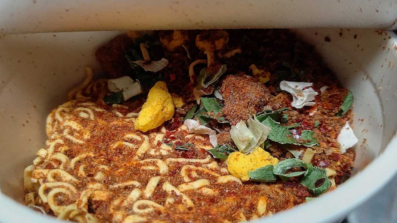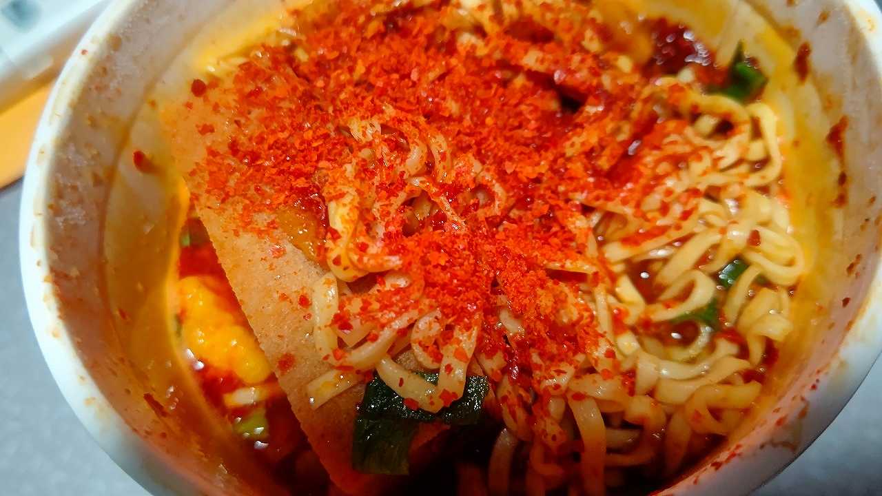 唐辛子の辛み、キムチの酸味、ニンニクの風味、みそのコクをきかせた、濃厚でクセになる味わいの旨辛スープに、「カップヌードル」史上最大量の唐辛子 "ぶっかけ焙煎唐辛子" がクセになる!