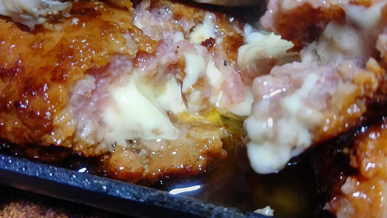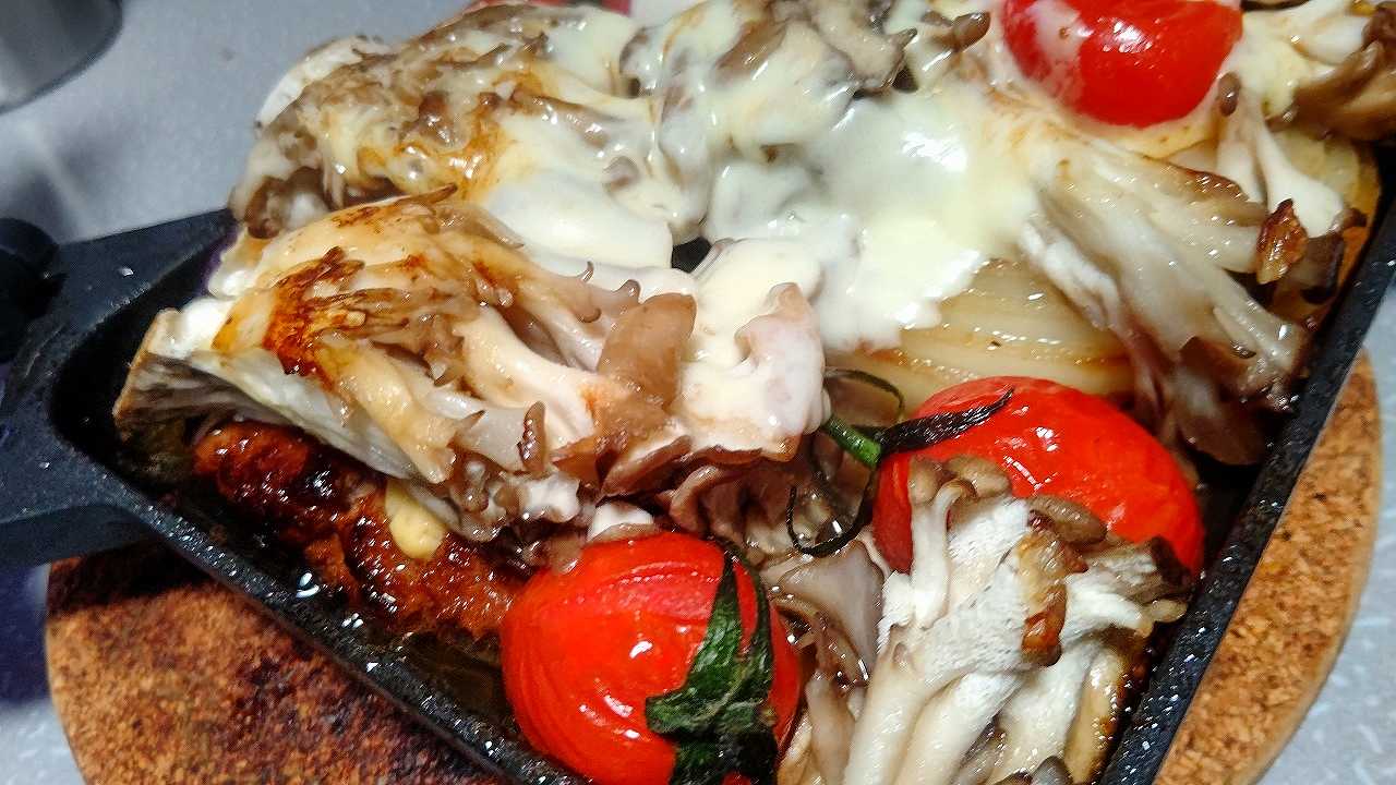 この前食べて、すごくおいしかった、チーズインハンバーグと舞茸、ミニトマト