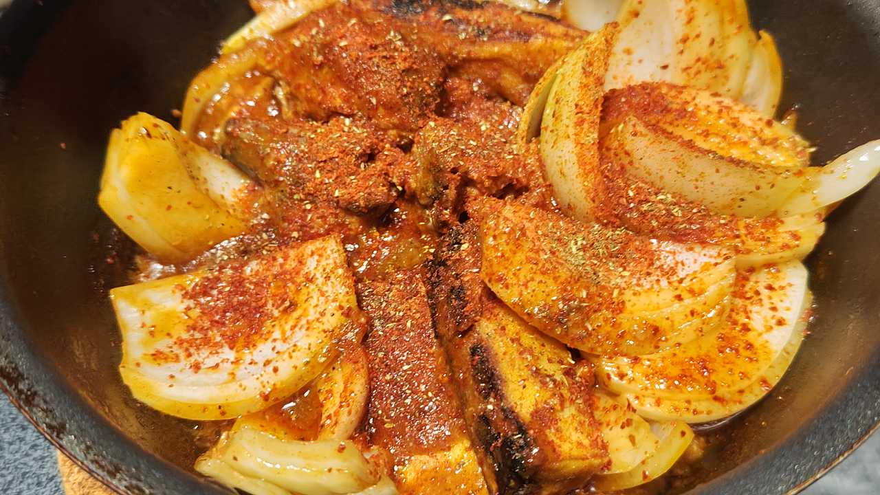 玉ねぎと、鯖缶煮付と、レトルトのチキンバターカレー
