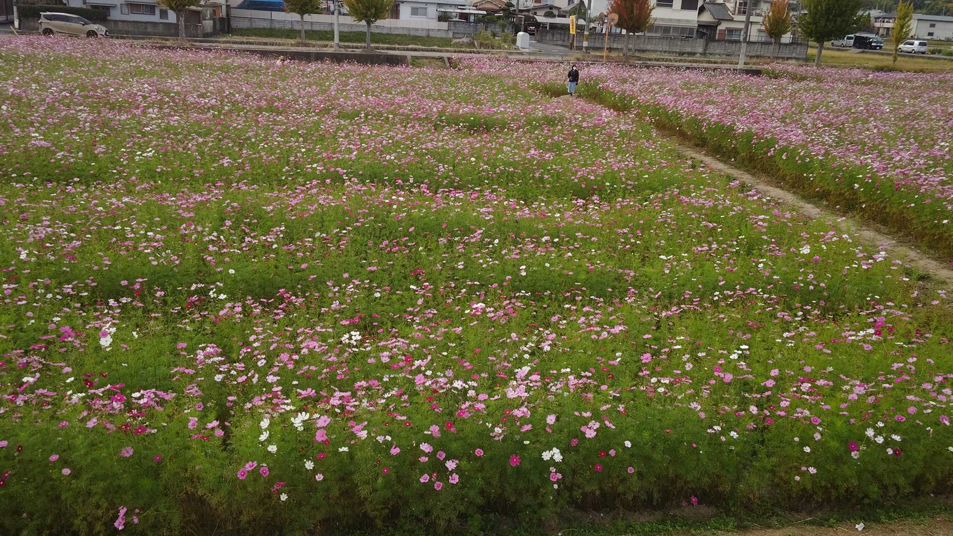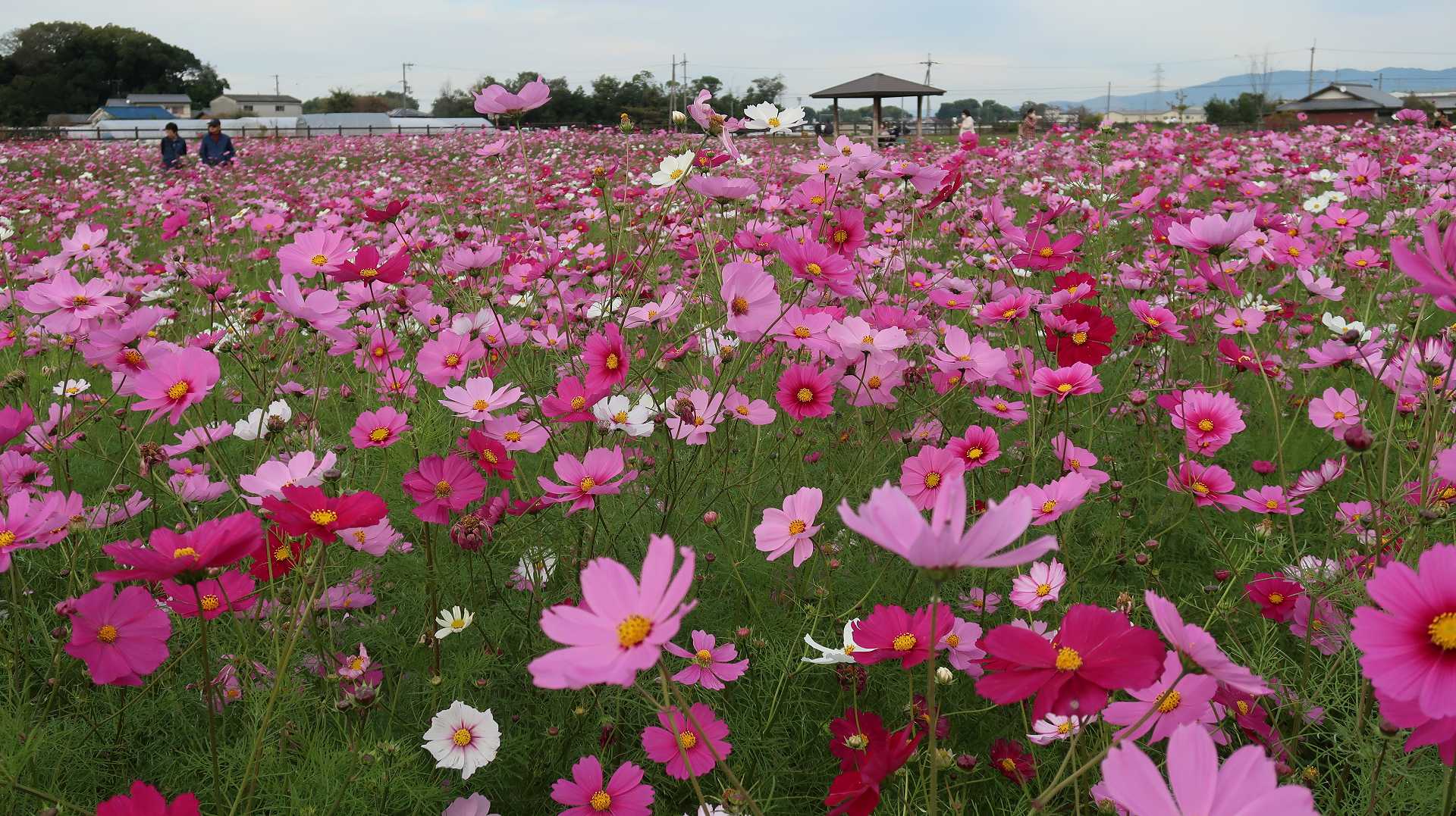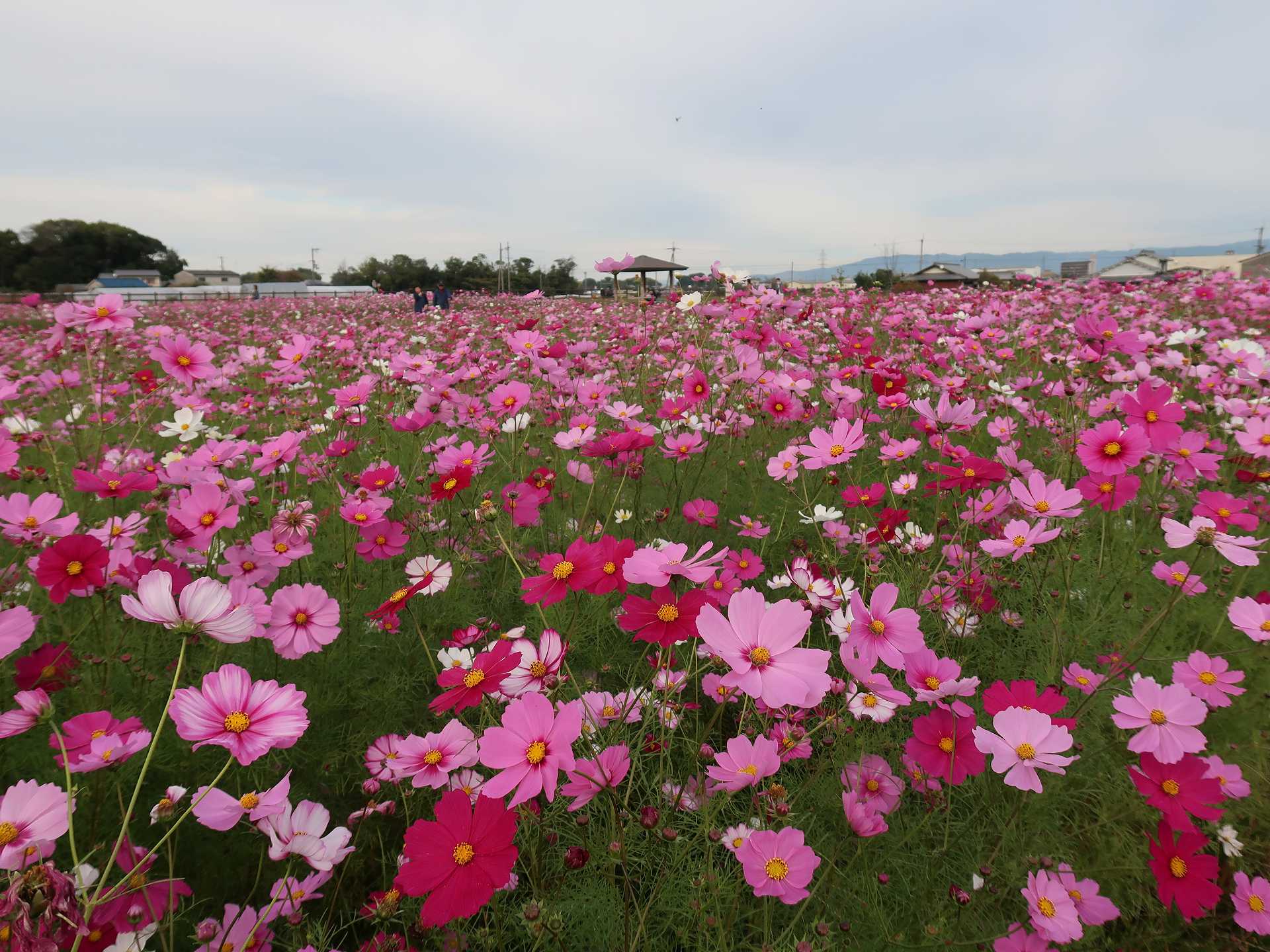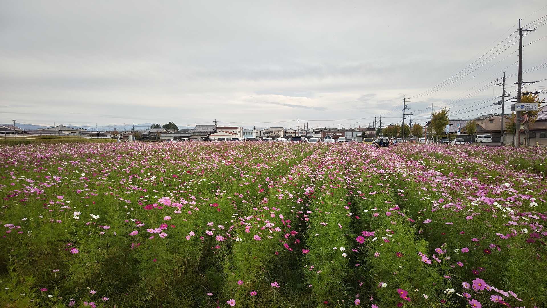 中宮寺跡周辺はコスモス畑が広がり、開花時期には多くの人が訪れています。