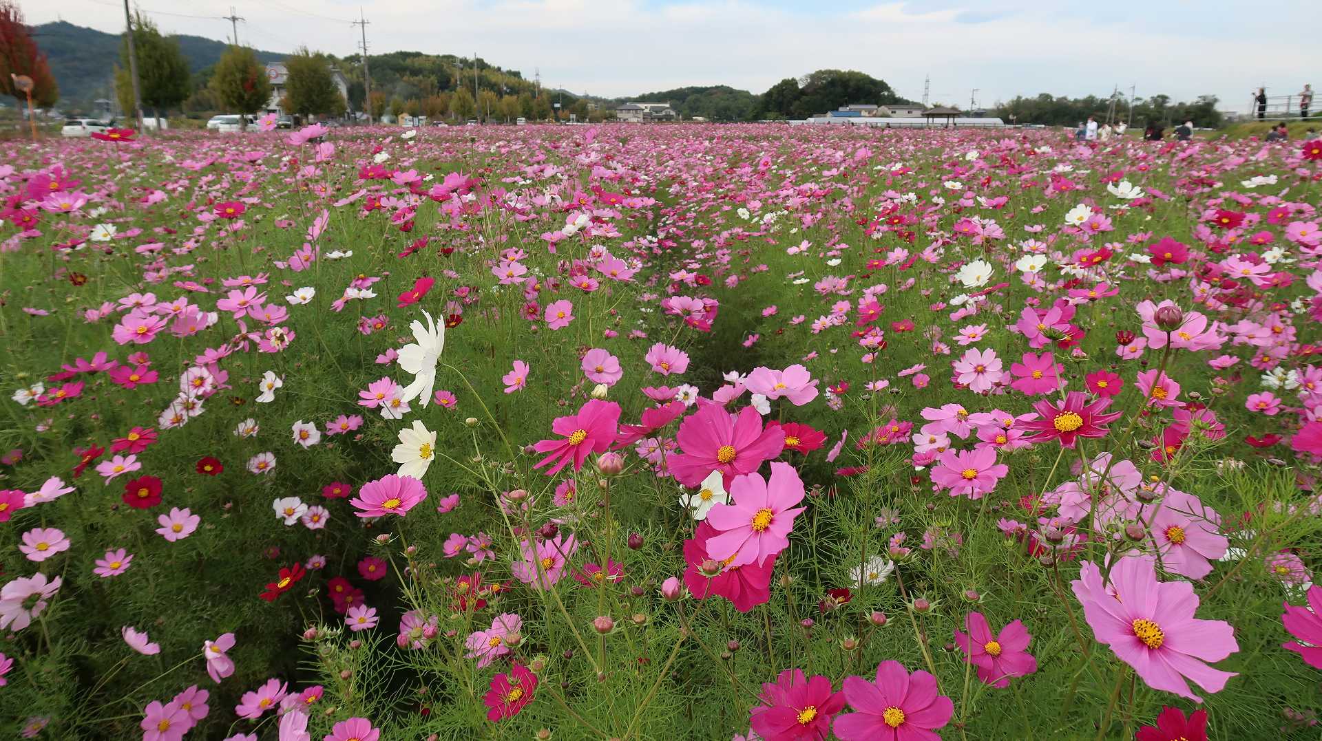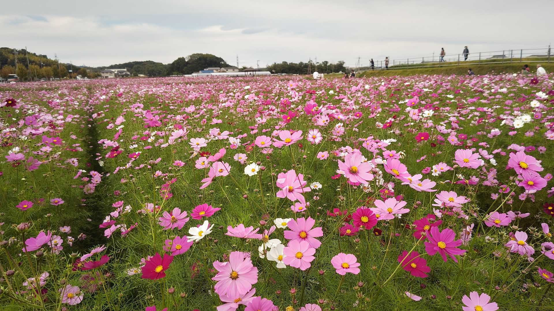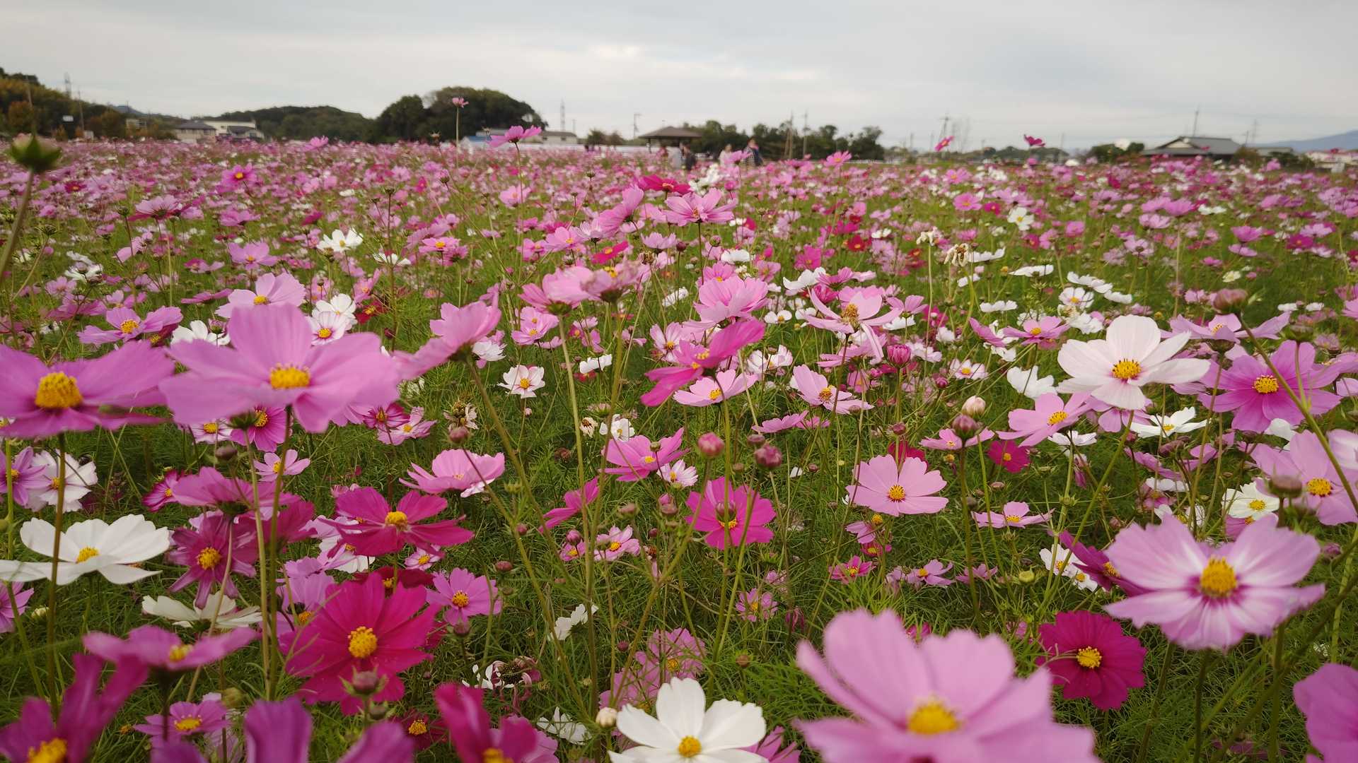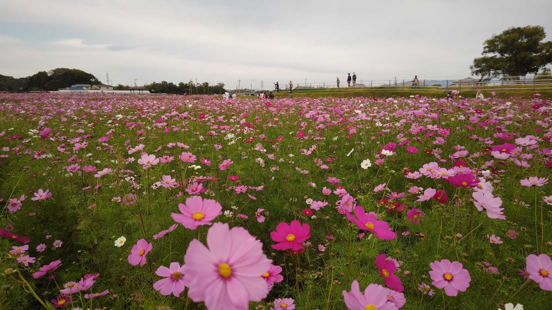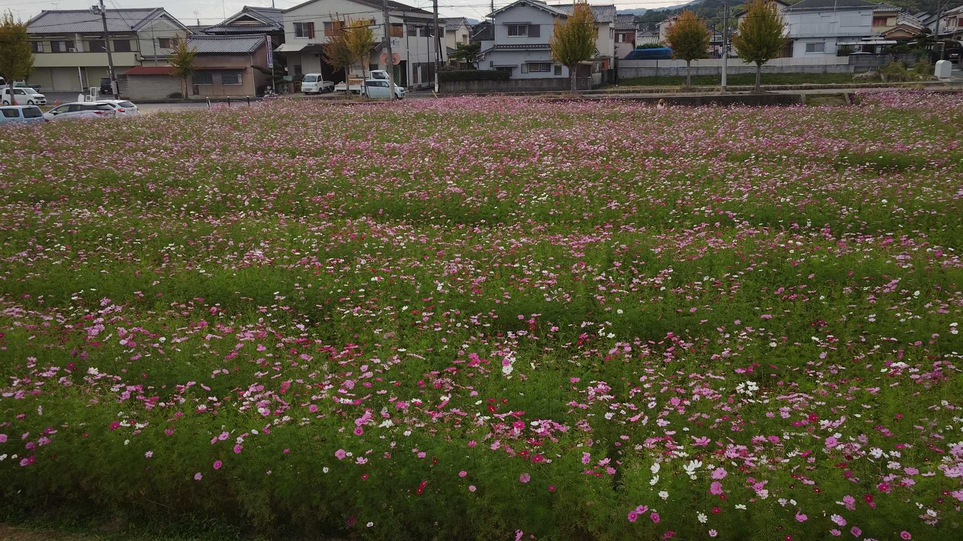 中宮寺跡周辺はコスモス畑が広がり、開花時期には多くの人が訪れています。
