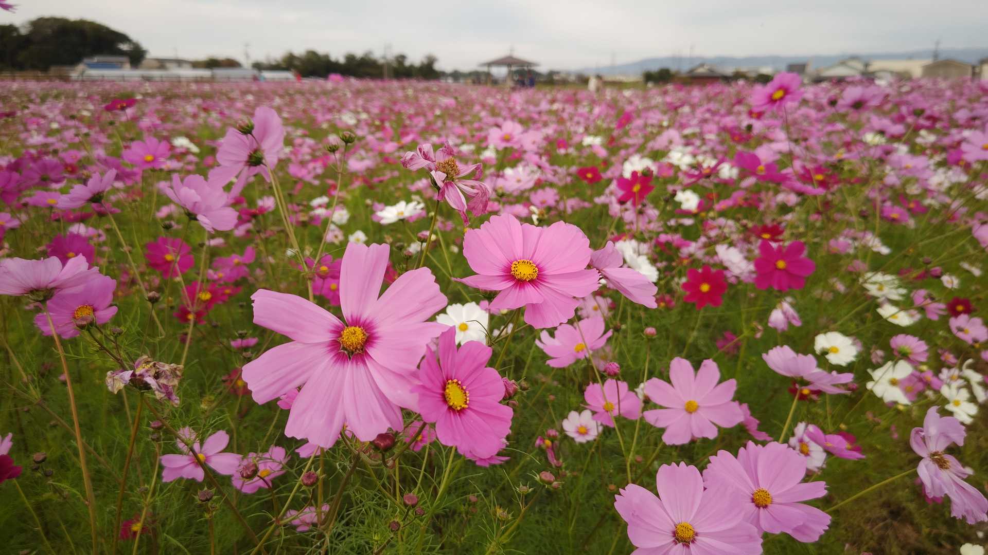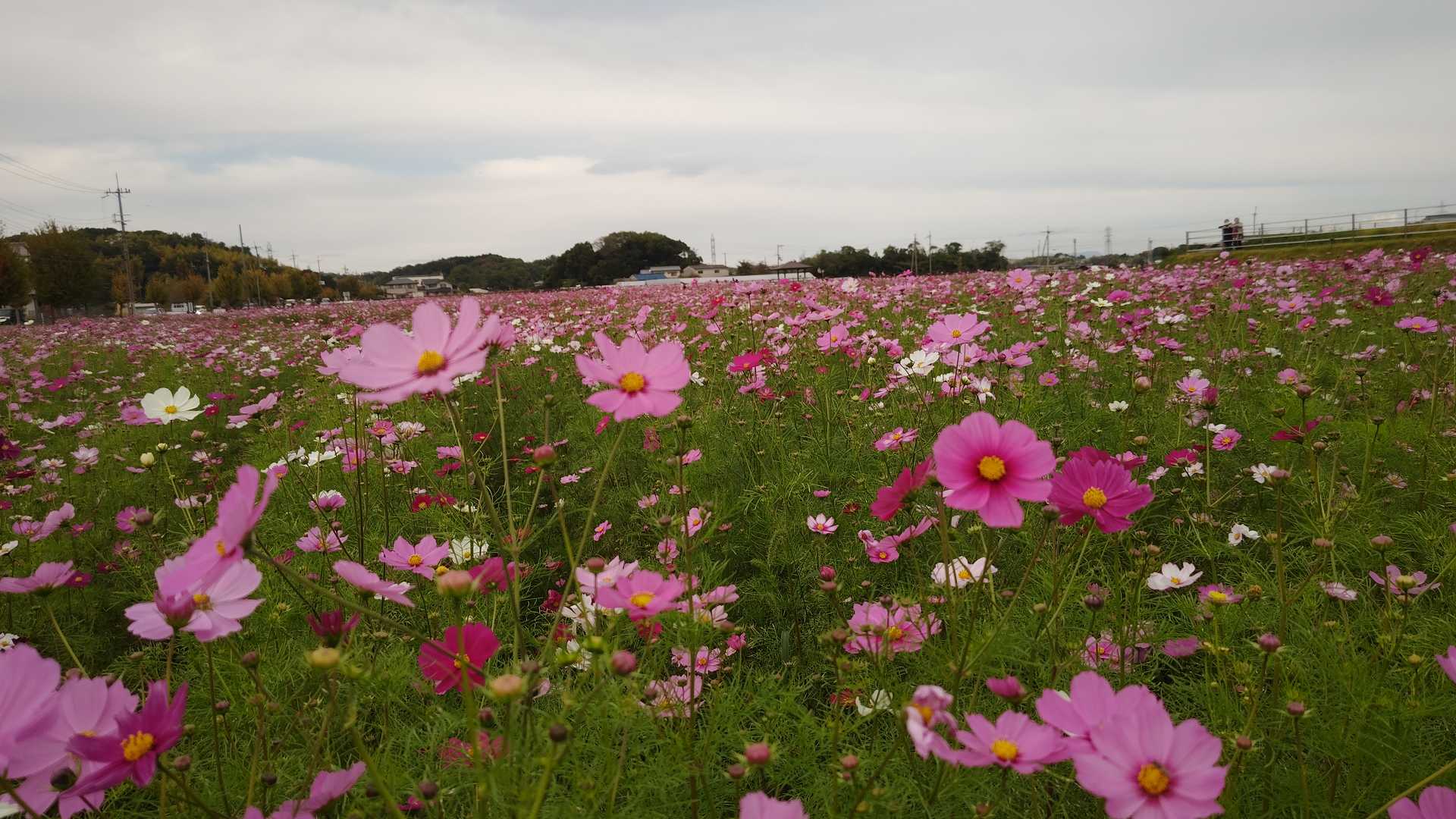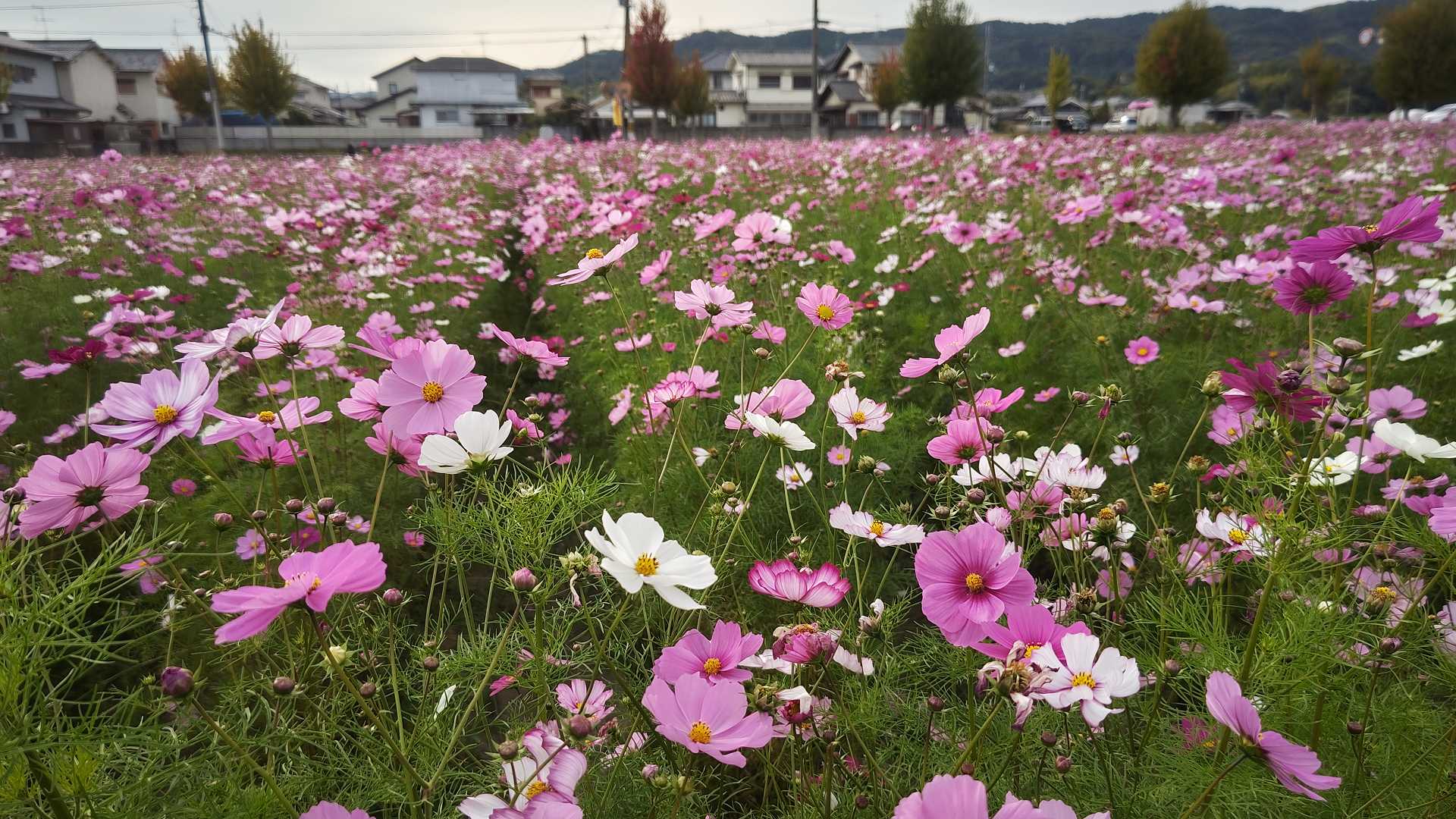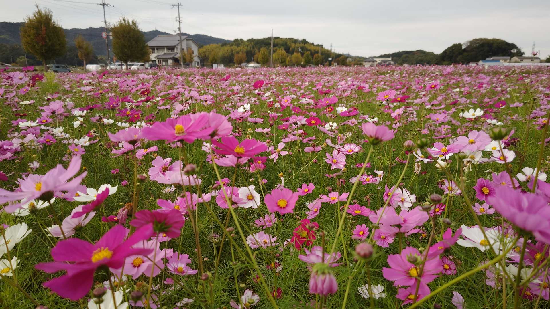 中宮寺跡周辺はコスモス畑が広がり、開花時期には多くの人が訪れています。